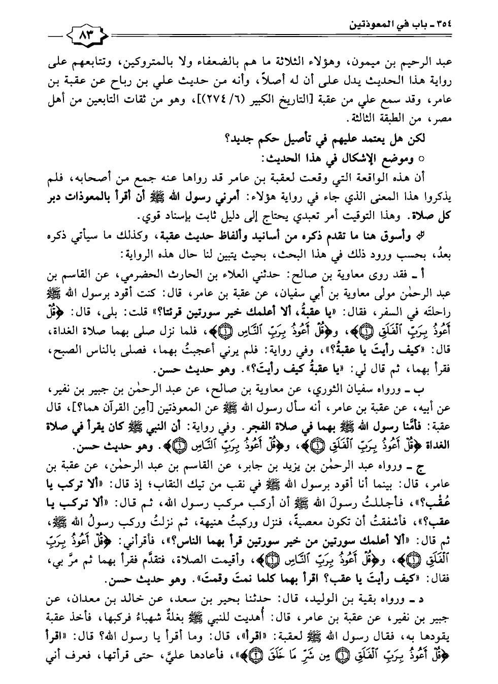 أن هذه الواقعة التي وقعت لعقبة بن عامر قد رواها عنه جمع من أصحابه، فلم يذكروا هذا المعنى الذي جاء في رواية هؤلاء: أمرني رسول الله -صلى الله عليه وسلم- أن أقرأ بالمعوذات دبر كل صلاة. وهذا التوقيت أمر تعبدي يحتاج إلى دليل ثابت بإسناد قوي.