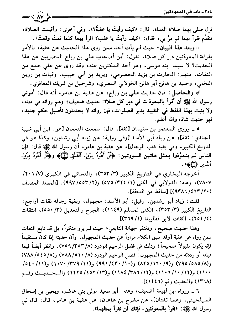 * والحاصل: فإن حديث علي بن رباح، عن عقبة بن عامر، أنه قال: أمرني رسول الله -صلى الله عليه وسلم- أن أقرأ بالمعوذات في دبر كل صلاة: حديث ضعيف؛ وهم رواته في متنه، ولا يثبت بهذا اللفظ في التقييد بدبر الصلوات، فإن رواته لا يحتملون تأصيل حكم جديد، فهو حديث شاذ، والله أعلم.