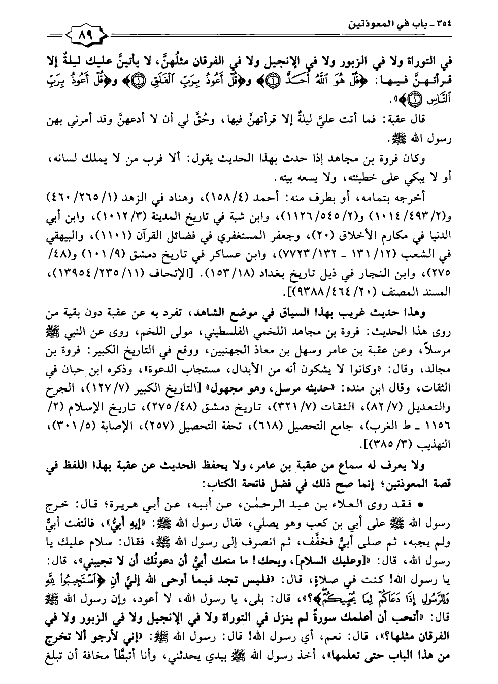 في التوراة ولا في الزبور ولا فى الإنجيل ولا في الفرقان مثلهنَّ، لا يأتينَّ عليك ليلةٌ إلا قرأتهنَّ فيها: {قُلْ هُوَ اللَّهُ أَحَدٌ (١)} و {قُلْ أَعُوذُ بِرَبِّ الْفَلَقِ (١)} و {قُلْ أَعُوذُ بِرَبِّ النَّاسِ (١)} ".