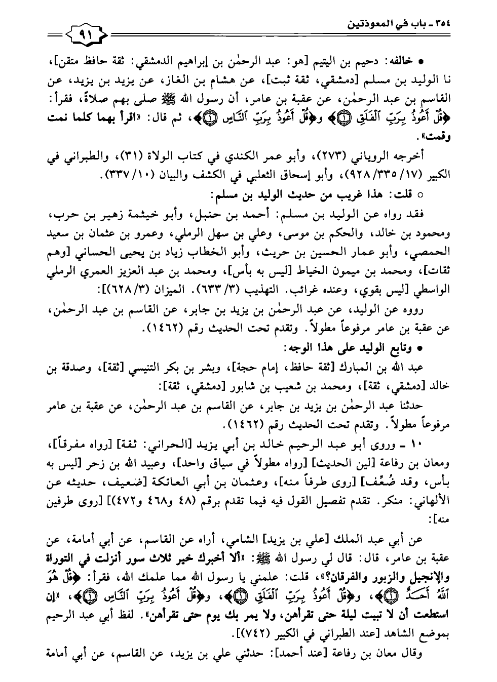 عن أبي عبد الملك [علي بن يزيد] الشامي، أراه عن القاسم، عن أبي أمامة، عن عقبة بن عامر، قال: قال لي رسول الله -صلى الله عليه وسلم-: "ألا أخبرك خير ثلاث سور أنزلت في التوراة والإنجيل والزبور والفرقان؟ "، قلت: علمني يا رسول الله مما علمك الله، فقرأ: {قُلْ هُوَ اللَّهُ أَحَدٌ (١)}، و {قُلْ أَعُوذُ بِرَبِّ الْفَلَقِ (١)}، و {قُلْ أَعُوذُ بِرَبِّ النَّاسِ (١)}، "أن استطعت أن لا تبيت ليلة حتى تقرأهن، ولا يمر بك يوم حتى تقرأهن". لفظ أبي عبد الرحيم بموضع الشاهد [عند الطبراني في الكبير (٧٤٢)].
