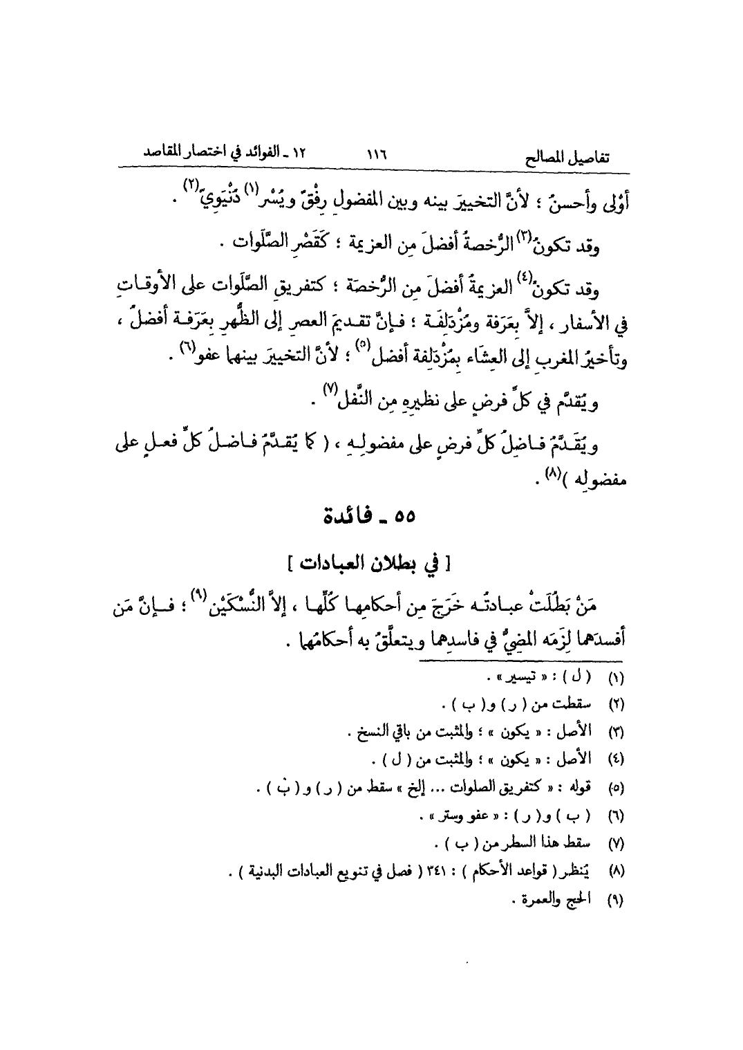 وَقد تكون الْعَزِيمَة أفضل من الرُّخْصَة كتفريق الصَّلَوَات على الْأَوْقَات فِي الْأَسْفَار إِلَّا بِعَرَفَة ومزدلفة فَإِن تَقْدِيم الْعَصْر إِلَى الظّهْر بِعَرَفَة أفضل وَتَأْخِير الْمغرب إِلَى الْعشَاء بِمُزْدَلِفَة أفضل لِأَن التَّخْيِير بَينهمَا عَفْو
