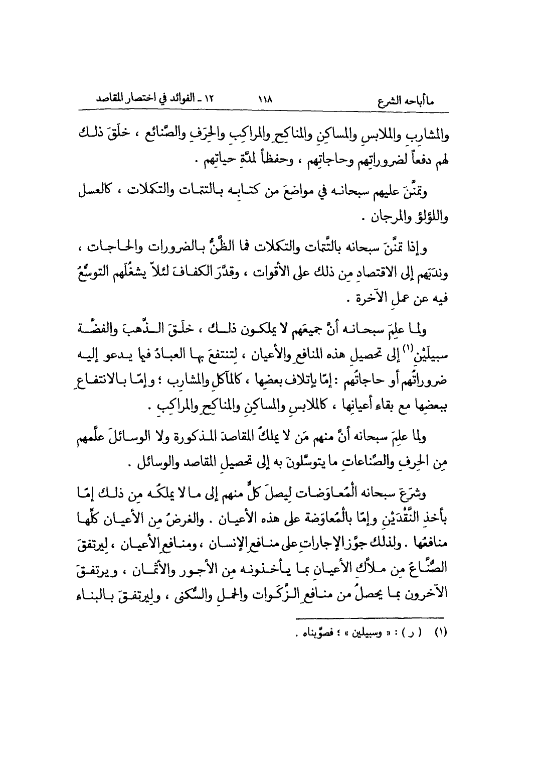 وَلما علم سُبْحَانَهُ أَن جَمِيعهم لَا يملكُونَ ذَلِك خلق الذَّهَب وَالْفِضَّة سبيلين إِلَى تَحْصِيل هَذِه الْمَنَافِع والأعيان لتنتفع بهَا الْعباد فِيمَا يَدْعُو إِلَيْهِ ضروراتهم أَو حاجاتهم إِمَّا بِإِتْلَاف بَعْضهَا كالمآكل والمشارب وَإِمَّا بِالِانْتِفَاعِ بِبَعْضِهَا مَعَ بَقَاء أعيانها كالملابس والمساكن والمناكح والمراكب
