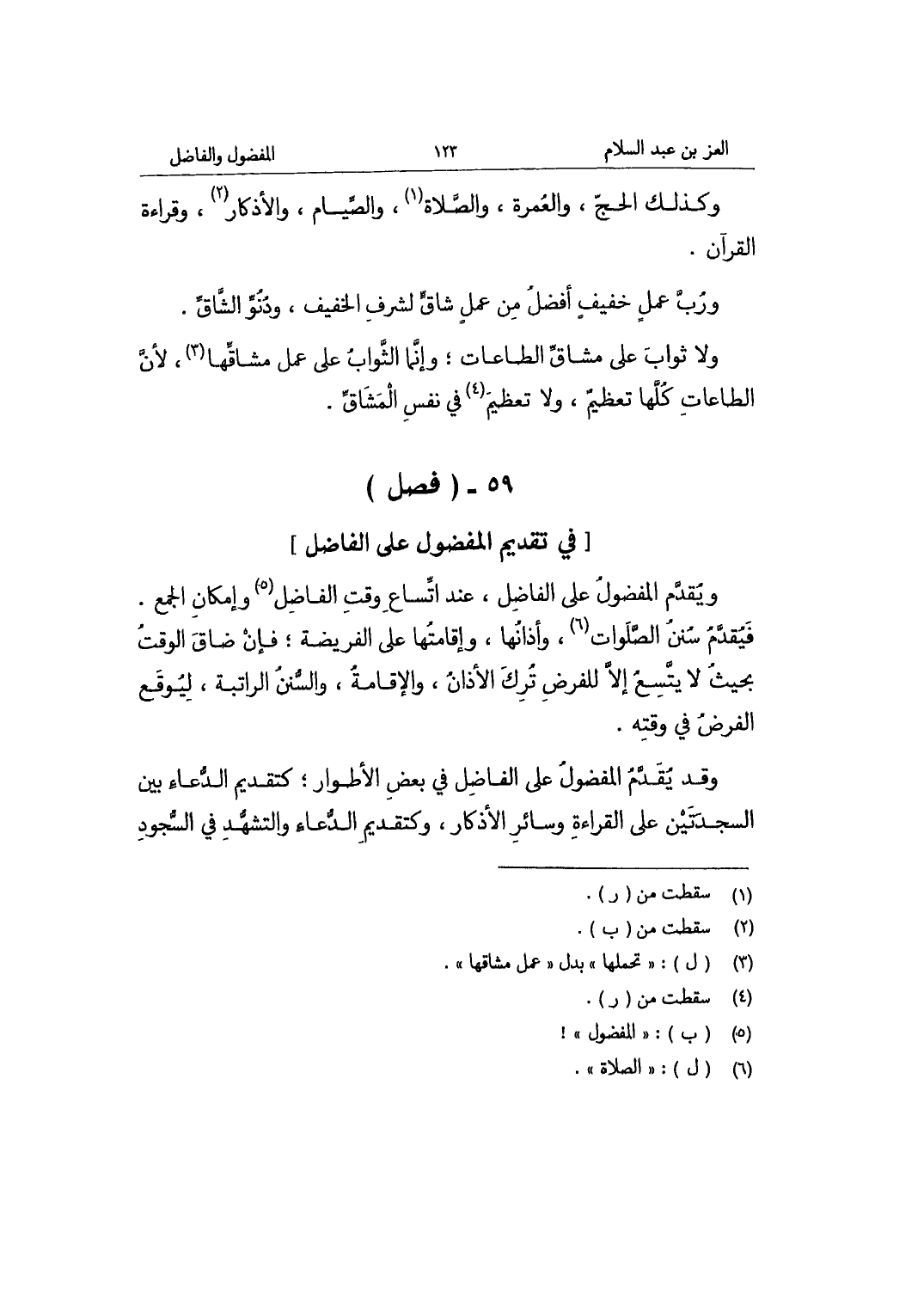 وَقد يقدم الْمَفْضُول على الْفَاضِل فِي بعض الأطوار كتقديم الدُّعَاء بَين السَّجْدَتَيْنِ على الْقِرَاءَة وَسَائِر الْأَذْكَار وكتقديم الدُّعَاء وَالتَّشَهُّد فِي السُّجُود
