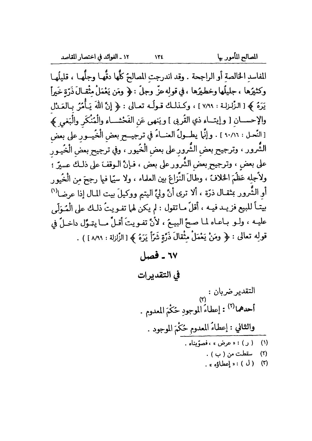 الْمَفَاسِد الْخَالِصَة أَو الراجحة وَقد اندرجت الْمصَالح كلهَا دقها وجلها قليلها وكثيرها جليلها وخطيرها فِي قَوْله عز وَجل {فَمن يعْمل مِثْقَال ذرة خيرا يره} الزلزلة 99 / 7 وَكَذَلِكَ قَوْله تَعَالَى {إِن الله يَأْمر بِالْعَدْلِ وَالْإِحْسَان وإيتاء ذِي الْقُرْبَى وَينْهى عَن الْفَحْشَاء وَالْمُنكر وَالْبَغي} النَّحْل 16 / 90 وَإِنَّمَا يطول العناء فِي تَرْجِيح بعض الخيور على بعض الشرور وترجيح بعض الشرور على بعض الخيور وَفِي تَرْجِيح بعض الخيور على بعض وترجيح بعض الشرور على بعض فَإِن الْوَقْف على ذَلِك عسير ولأجله عظم الْخلاف وَطَالَ النزاع بَين الْعلمَاء وَلَا سِيمَا فِيمَا رجح من الخيور أَو الشرور بمثقال ذرة أَلا ترى أَن ولي الْيَتِيم ووكيل بَيت المَال إِذا عرضا بَيْتا للْبيع فزيد فِيهِ أقل مَا تَقول لم يكن لَهما تَفْوِيت ذَلِك على الْمولى عَلَيْهِ وَلَو باعاه لما صَحَّ البيع لِأَن تَفْوِيت أقل مَا يتمول دَاخل فِي قَوْله تَعَالَى {وَمن يعْمل مِثْقَال ذرة شرا يره} الزلزلة 99 / 8