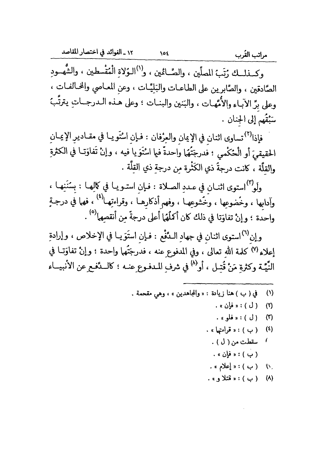 فَإِذا تساوى اثْنَان فِي الْإِيمَان والعرفان فَإِن اسْتَويَا فِي مقادير الْإِيمَان الْحَقِيقِيّ أَو الْحكمِي فدرجتهما وَاحِدَة فِيمَا اسْتَويَا فِيهِ وَإِن تَفَاوتا فِي الْكَثْرَة والقلة كَانَت دَرَجَة ذِي الْكَثْرَة من دَرَجَة ذِي الْقلَّة