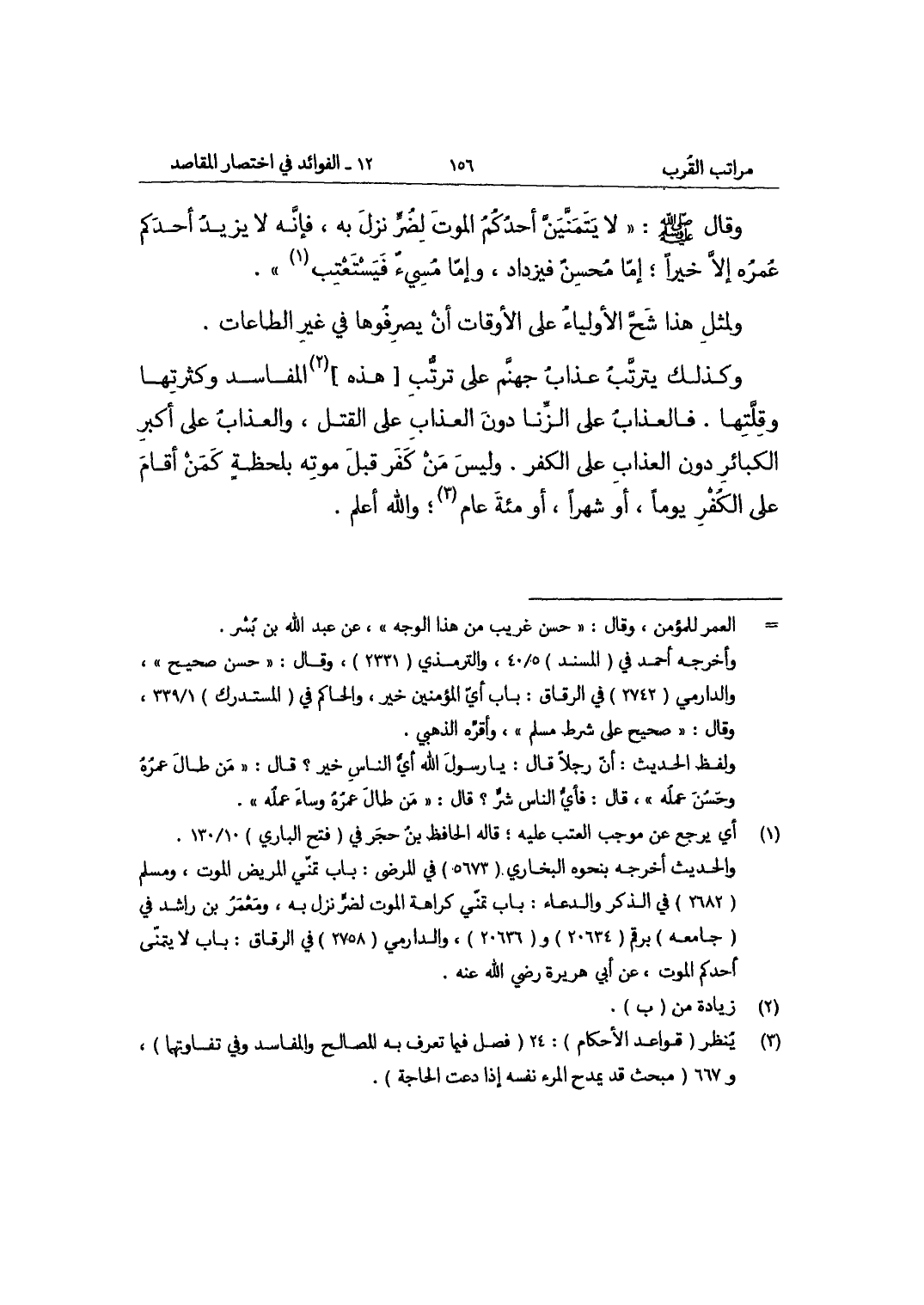 وَكَذَلِكَ يَتَرَتَّب عَذَاب جَهَنَّم على ترَتّب هَذِه الْمَفَاسِد وَكَثْرَتهَا وقلتها فالعذاب على الزِّنَا دون الْعَذَاب على الْقَتْل وَالْعَذَاب على أكبر الْكَبَائِر دون الْعَذَاب على الْكفْر وَلَيْسَ من كفر قبل مَوته بلحظة كمن أَقَامَ على الْكفْر يَوْمًا أَو شهرا أَو مئة عَام وَالله أعلم