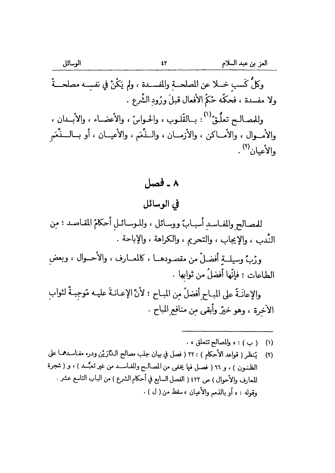 للْمصَالح والمفاسد أَسبَاب ووسائل وللوسائل أَحْكَام الْمَقَاصِد من النّدب والإيجاب وَالتَّحْرِيم وَالْكَرَاهَة وَالْإِبَاحَة