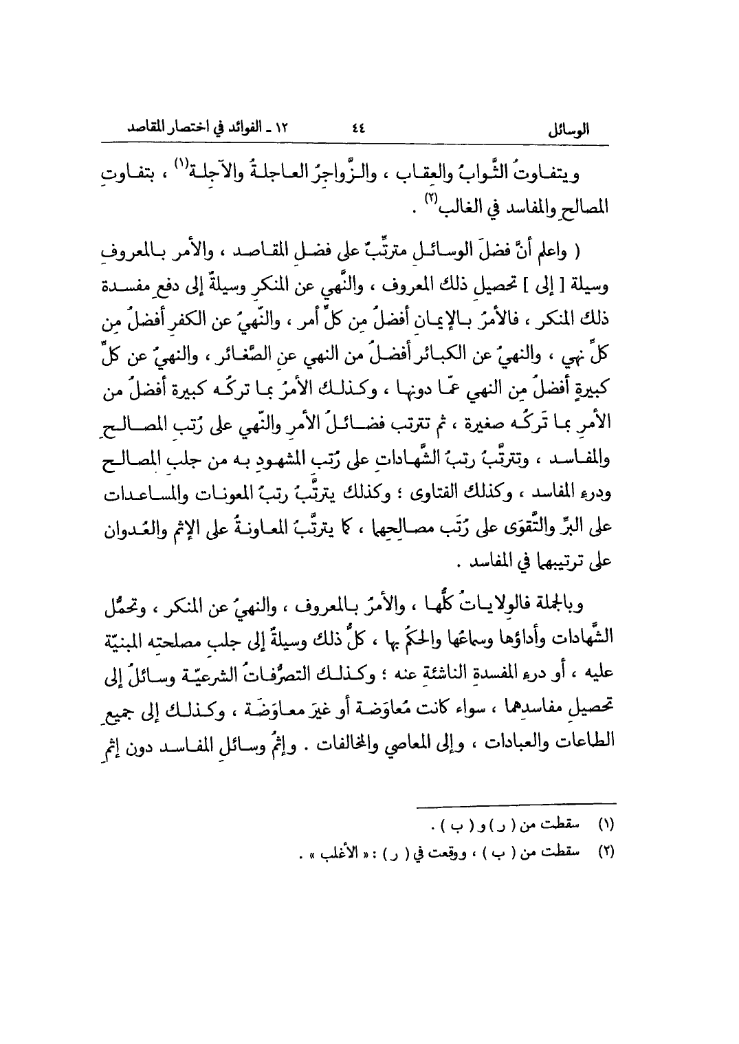 وَاعْلَم أَن فضل الْوَسَائِل مترتب على فضل الْمَقَاصِد وَالْأَمر بِالْمَعْرُوفِ وَسِيلَة إِلَى تَحْصِيل ذَلِك الْمَعْرُوف وَالنَّهْي عَن الْمُنكر وَسِيلَة إِلَى دفع مفْسدَة ذَلِك الْمُنكر فَالْأَمْر بِالْإِيمَان أفضل من كل أَمر وَالنَّهْي عَن الْكفْر أفضل من كل نهي وَالنَّهْي عَن الْكَبَائِر أفضل من النَّهْي عَن الصَّغَائِر وَالنَّهْي عَن كل كَبِيرَة أفضل من النَّهْي عَمَّا دونهَا وَكَذَلِكَ الْأَمر بِمَا تَركه كَبِيرَة أفضل من الْأَمر بِمَا تَركه صَغِيرَة ثمَّ تترتب فَضَائِل الْأَمر وَالنَّهْي على رتب الْمصَالح والمفاسد وتترتب رتب الشَّهَادَات على رتب الْمَشْهُود بِهِ من جلب الْمصَالح ودرء الْمَفَاسِد وَكَذَلِكَ الْفَتَاوَى وَكَذَلِكَ يَتَرَتَّب رتب المعونات والمساعدات على الْبر وَالتَّقوى على رتب مصالحهما كَمَا يَتَرَتَّب المعاونة على الْإِثْم والعدوان على ترتيبهما فِي الْمَفَاسِد
