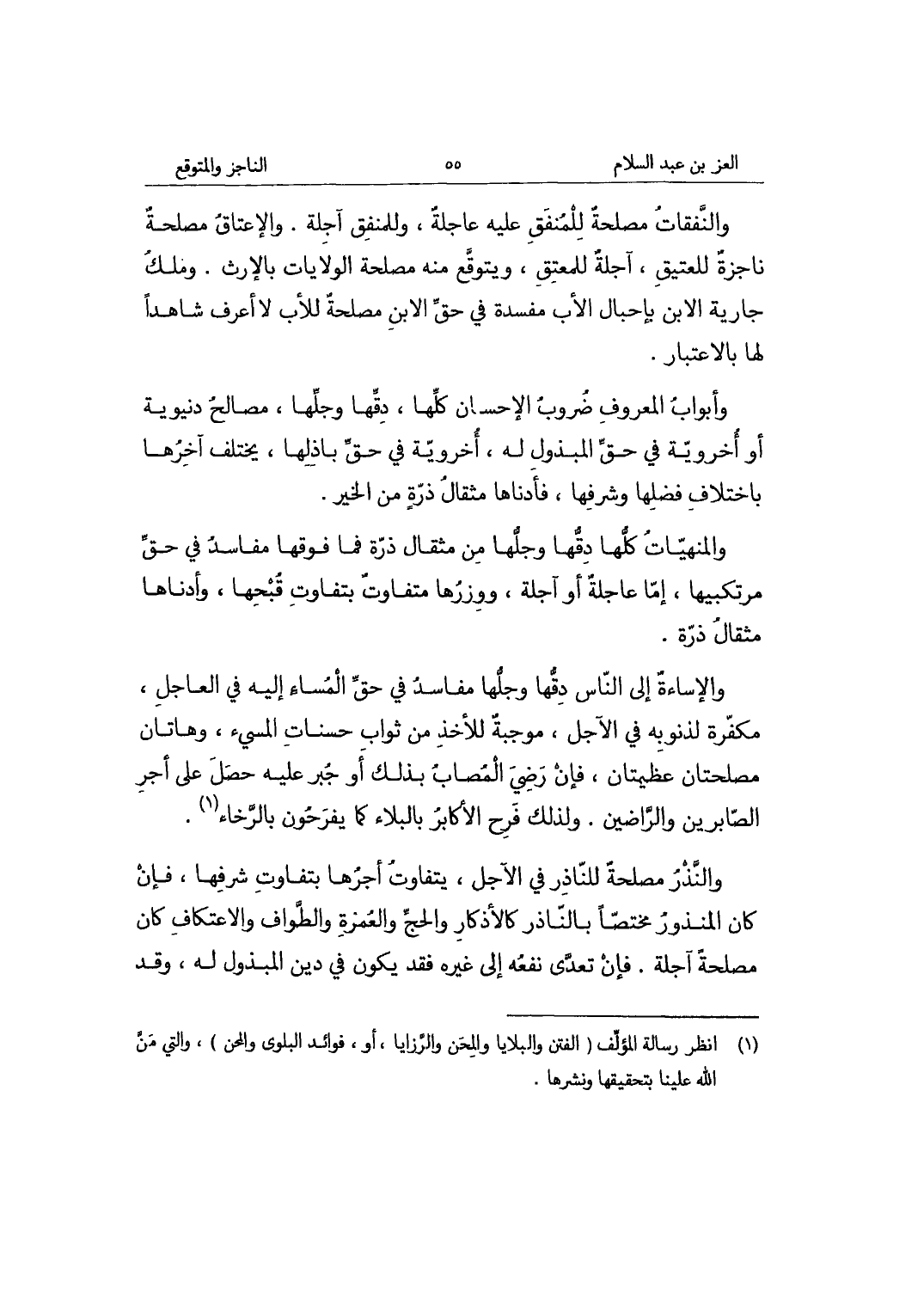 وَالنّذر مصلحَة للناذر فِي الآجل يتَفَاوَت أجرهَا بتفاوت شرفها فَإِن كَانَ الْمَنْذُور مُخْتَصًّا بالناذر كالأذكار وَالْحج وَالْعمْرَة وَالطّواف وَالِاعْتِكَاف كَانَ مصلحَة آجلة فَإِن تعدى نَفعه إِلَى غَيره فقد يكون فِي دين المبذول لَهُ وَقد