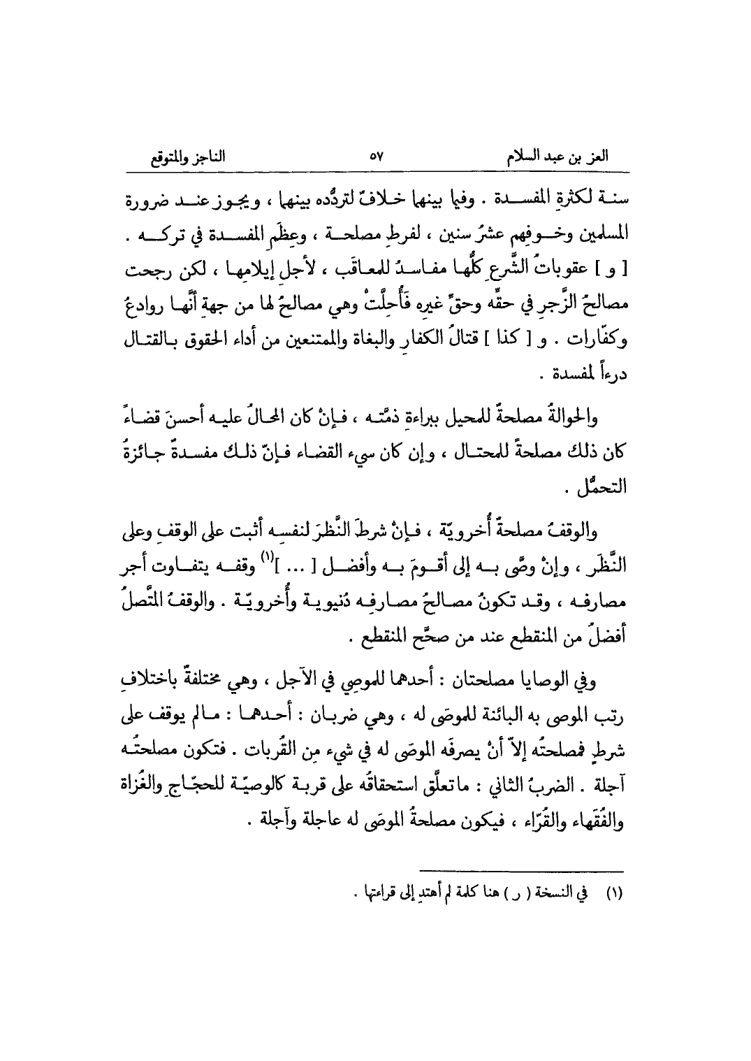 وَفِي الْوَصَايَا مصلحتان أَحدهمَا للْمُوصي فِي الآجل وَهِي مُخْتَلفَة باخْتلَاف رتب الْمُوصى بِهِ البائنة للْمُوصى لَهُ وَهِي ضَرْبَان أَحدهمَا مَا لم يُوقف على شَرط فمصلحته إِلَّا أَن يصرفهُ الْمُوصى لَهُ فِي شَيْء من القربات فَتكون مصْلحَته آجلة الضَّرْب الثَّانِي مَا تعلق اسْتِحْقَاقه على قربَة كَالْوَصِيَّةِ للحجاج والغزاة وَالْفُقَهَاء والقراء فَيكون مصلحَة الْمُوصى لَهُ عاجلة وآجلة