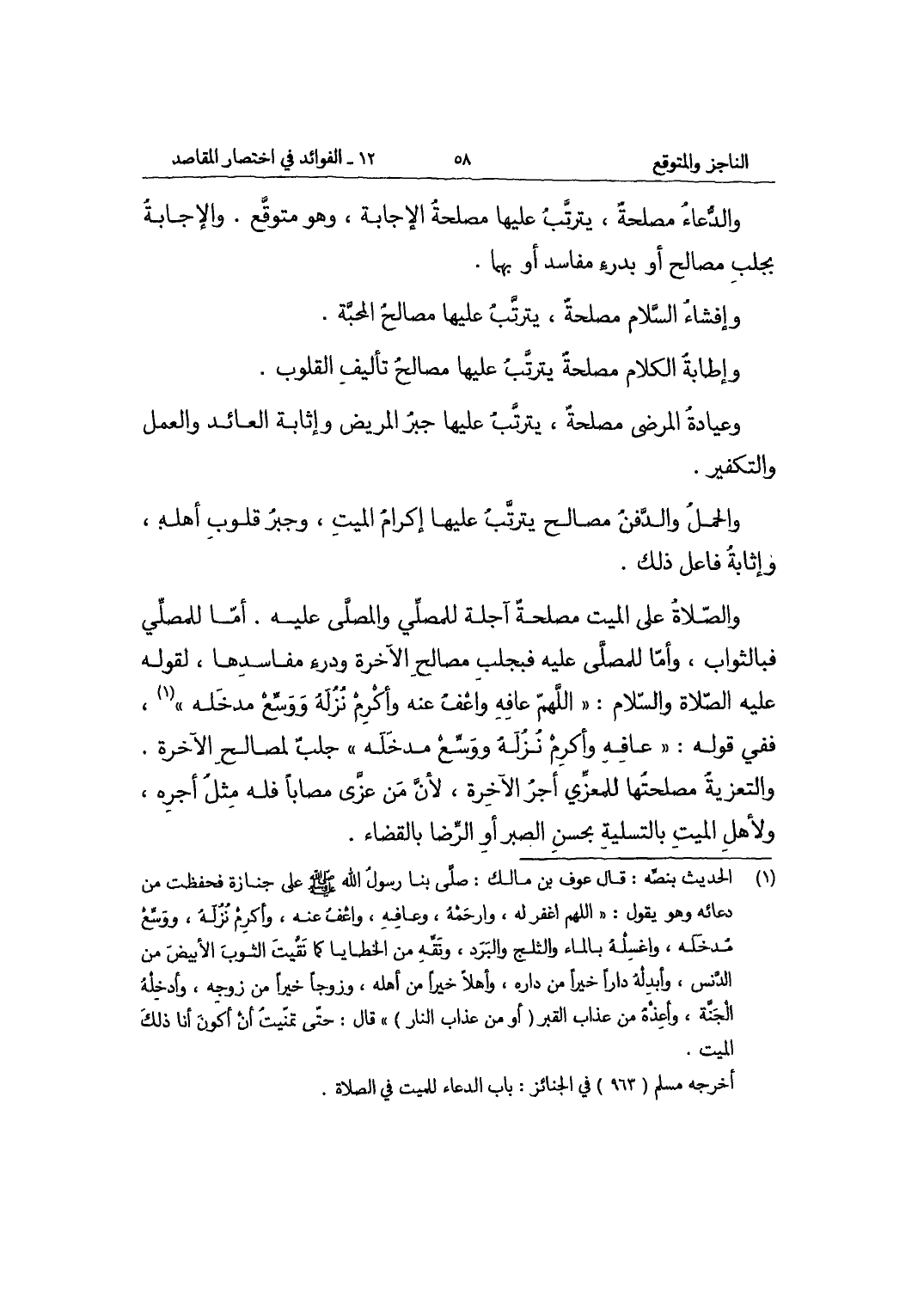 وَالصَّلَاة على الْمَيِّت مصلحَة آجلة للْمُصَلِّي والمصلى عَلَيْهِ أما للْمُصَلِّي فبالثواب وَأما للْمُصَلِّي عَلَيْهِ فبجلب مصَالح الْآخِرَة ودرء مفاسدها لقَوْله عَلَيْهِ الصَّلَاة وَالسَّلَام اللَّهُمَّ عافه واعف عَنهُ وَأكْرم نزله ووسع مدخله فَفِي قَوْله عافه وَأكْرم نزله ووسع مدخله جلب لمصَالح الْآخِرَة والتعزية مصلحتها للمعزي أجر الْآخِرَة لِأَن من عزى مصابا فَلهُ مثل أجره وَلأَهل الْمَيِّت بالتسلية بِحسن الصَّبْر أَو الرِّضَا بِالْقضَاءِ