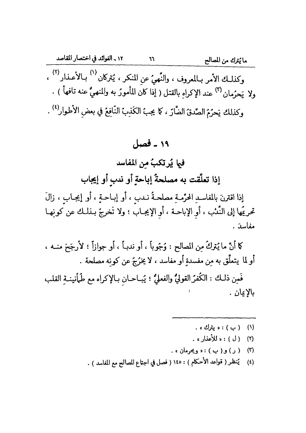 فصل فِيمَا يرتكب من الْمَفَاسِد إِذا تعلّقت بِهِ مصلحَة إِبَاحَة أَو ندب أَو إِيجَاب