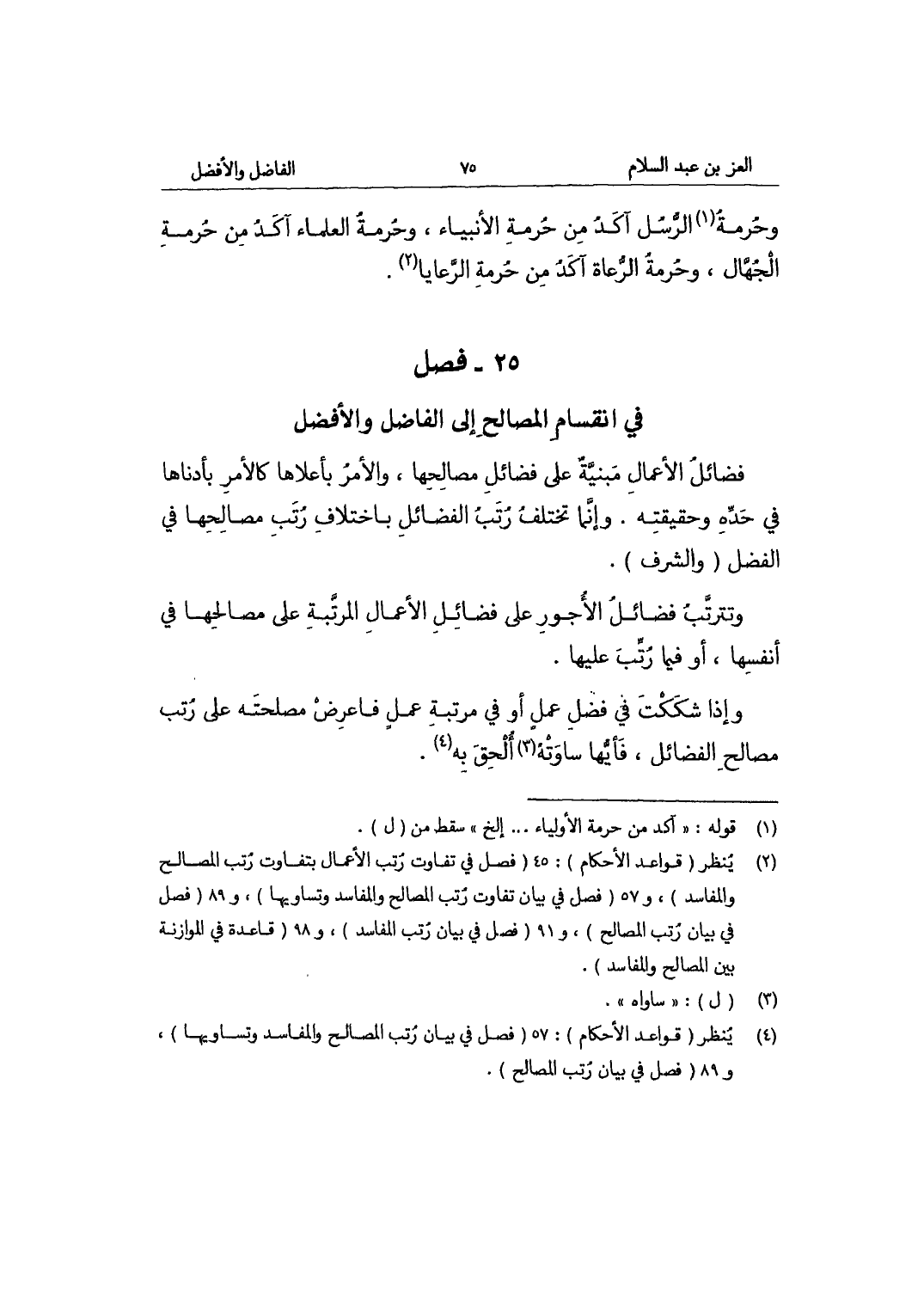 فصل فِي انقسام الْمصَالح إِلَى الْفَاضِل وَالْأَفْضَل