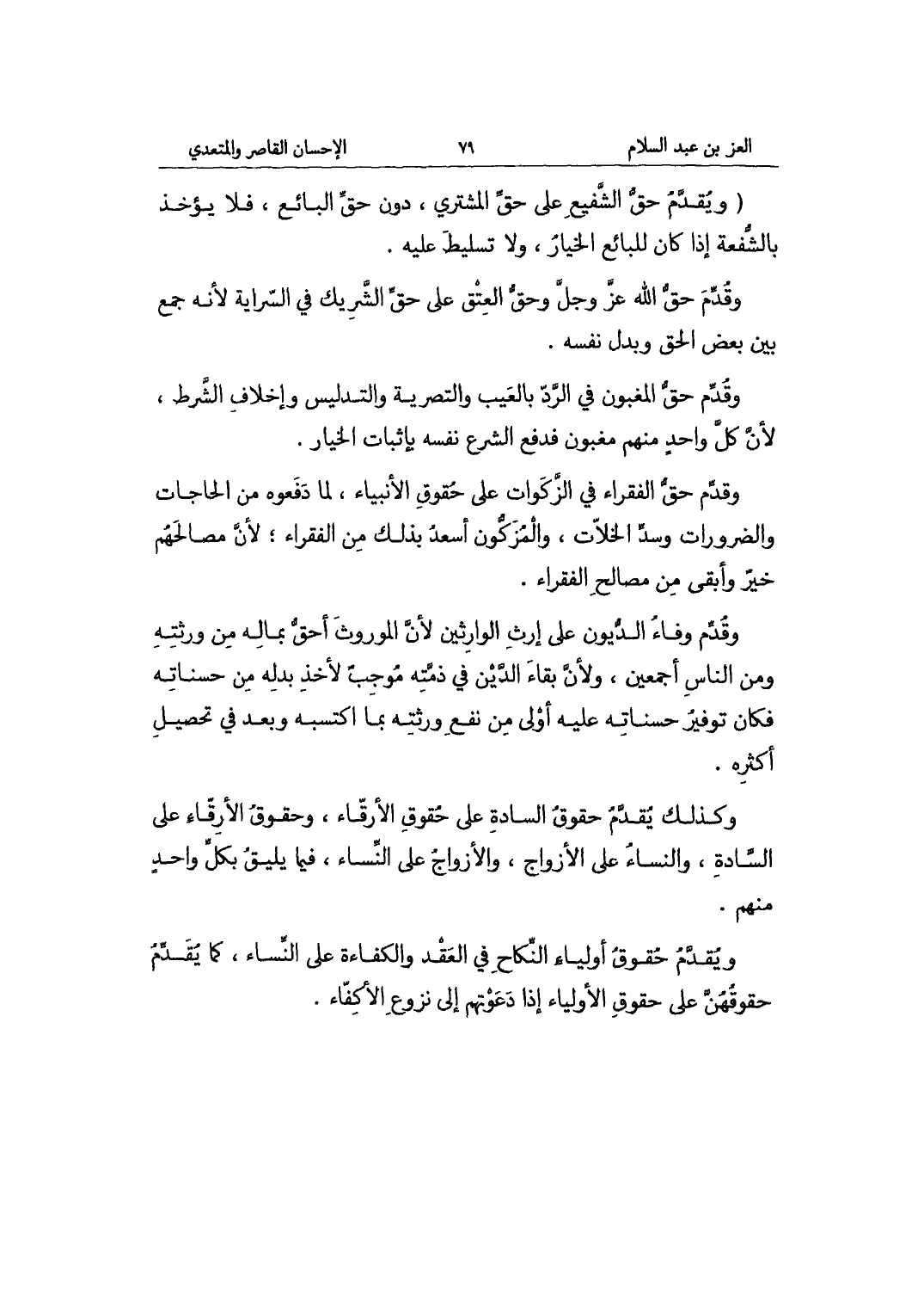 وَكَذَلِكَ يقدم حُقُوق السَّادة على حُقُوق الأرقاء وَحُقُوق الأرقاء على السَّادة وَالنِّسَاء على الْأزْوَاج والأزواج على النِّسَاء فِيمَا يَلِيق بِكُل وَاحِد مِنْهُم