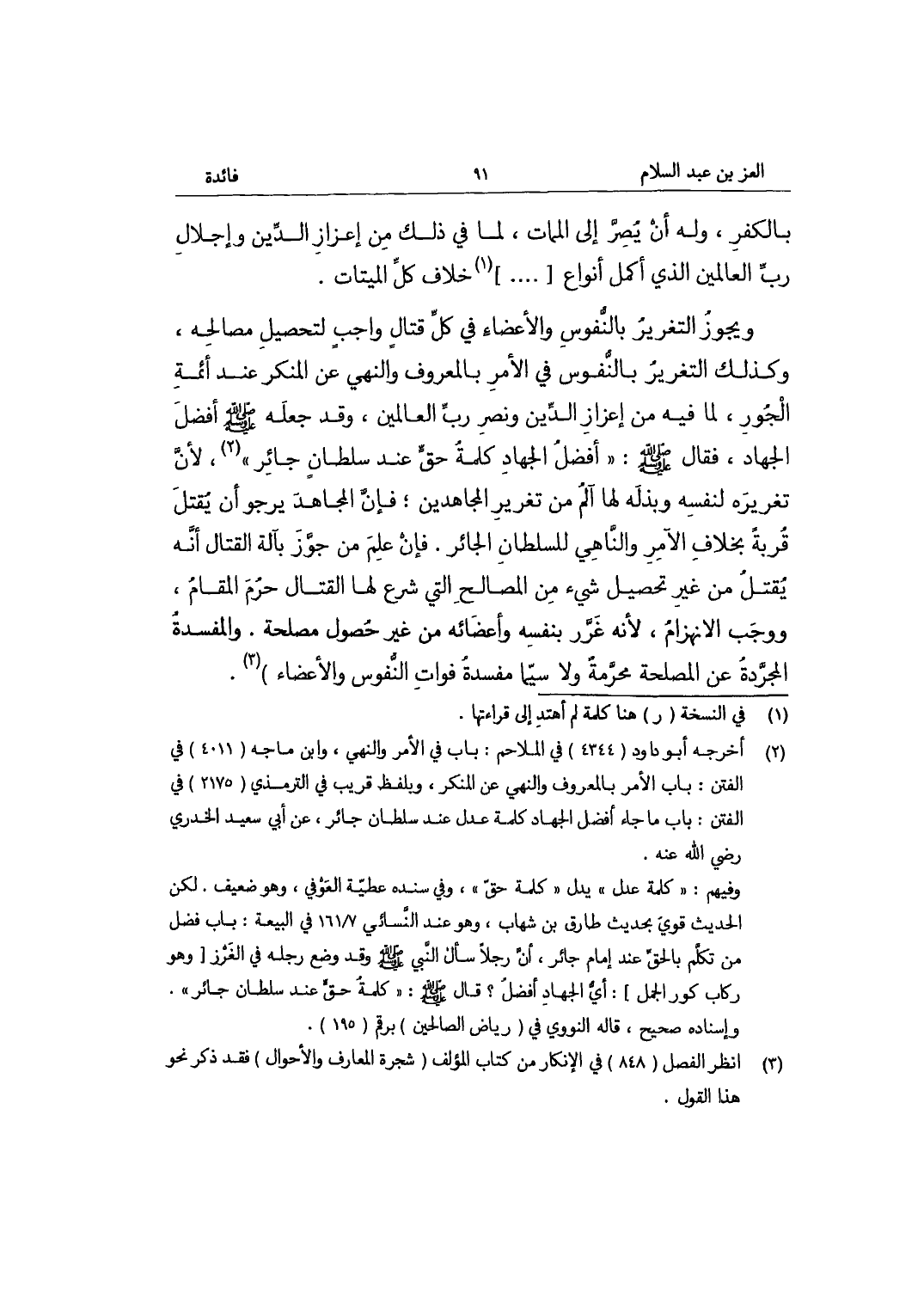 وَيجوز التَّغْرِير بالنفوس والأعضاء فِي كل قتال وَاجِب لتَحْصِيل مَصَالِحه وَكَذَلِكَ التَّغْرِير بالنفوس فِي الْأَمر بِالْمَعْرُوفِ وَالنَّهْي عَن الْمُنكر عِنْد أَئِمَّة الْجور لما فِيهِ من إعزاز الدّين وَنصر رب الْعَالمين وَقد جعله صلى الله عَلَيْهِ وَسلم أفضل الْجِهَاد فَقَالَ صلى الله عَلَيْهِ وَسلم أفضل الْجِهَاد كلمة حق عِنْد سُلْطَان جَائِر لِأَن تغريره لنَفسِهِ وبذله لَهَا آلم من تغرير الْمُجَاهدين فَإِن الْمُجَاهِد يَرْجُو أَن يقتل قربَة بِخِلَاف الْآمِر والناهي للسُّلْطَان الجائر فَإِن علم من جوز بِآلَة الْقِتَال أَنه يقتل من غير تَحْصِيل شَيْء من الْمصَالح الَّتِي شرع لَهَا الْقِتَال حرم الْمقَام وَوَجَب الانهزام لِأَنَّهُ غرر بِنَفسِهِ وأعضائه من غير حُصُول مصلحَة والمفسدة الْمُجَرَّدَة عَن الْمصلحَة مُحرمَة وَلَا سِيمَا مفْسدَة فَوَات النُّفُوس والأعضاء
