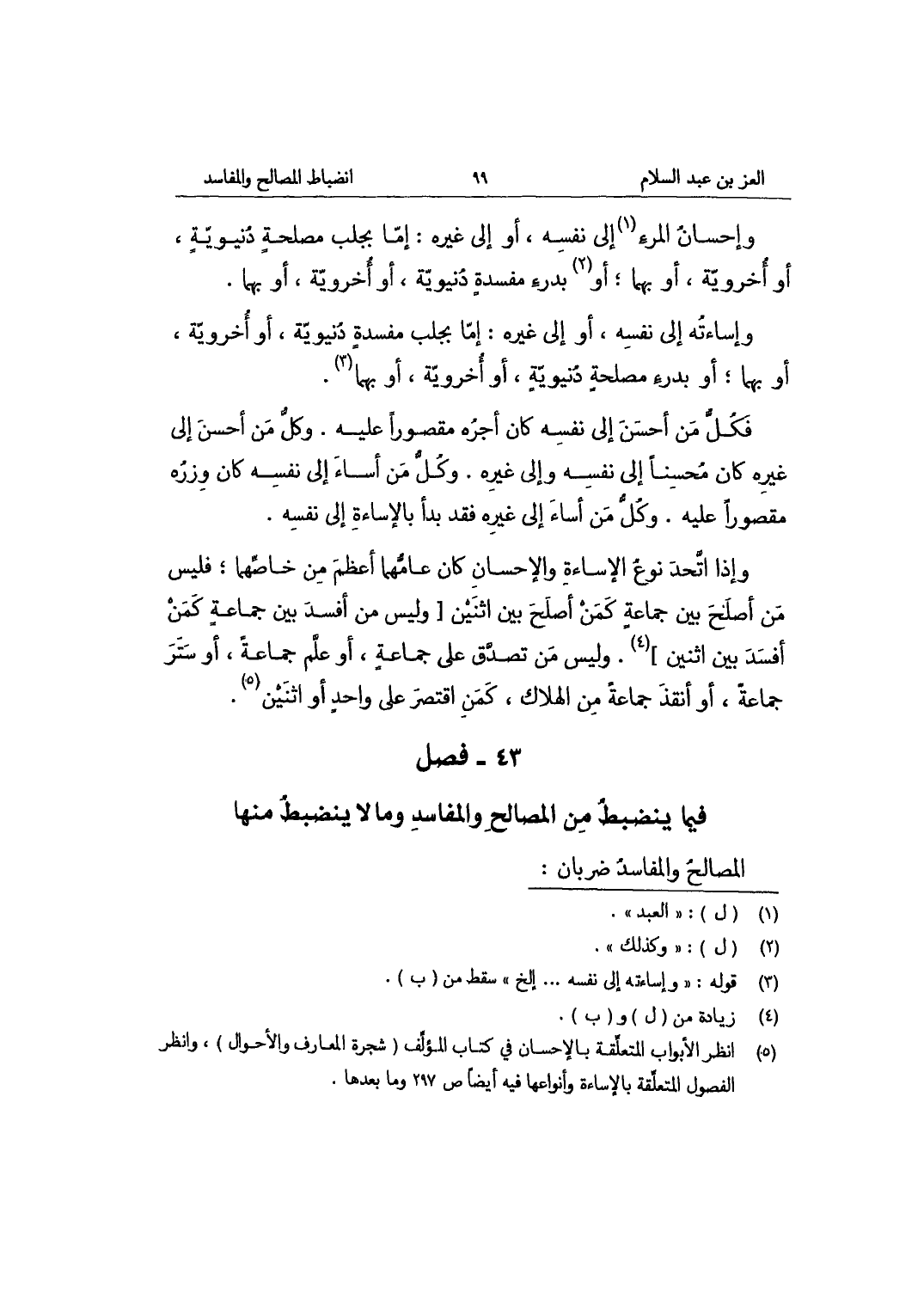 وإساءته إِلَى نَفسه أَو إِلَى غَيره إِمَّا بجلب مفْسدَة دنيوية أَو أخروية أَو بهما أَو بدرء مصلحَة دنيوية أَو أخروية أَو بهما فَكل من أحسن إِلَى نَفسه كَانَ أجره مَقْصُورا عَلَيْهِ وكل من أحسن إِلَى غَيره كَانَ محسنا إِلَى نَفسه وَإِلَى غَيره وكل من أَسَاءَ إِلَى نَفسه كَانَ وزره مَقْصُورا عَلَيْهِ وكل من أَسَاءَ إِلَى غَيره فقد بَدَأَ بالإساءة إِلَى نَفسه