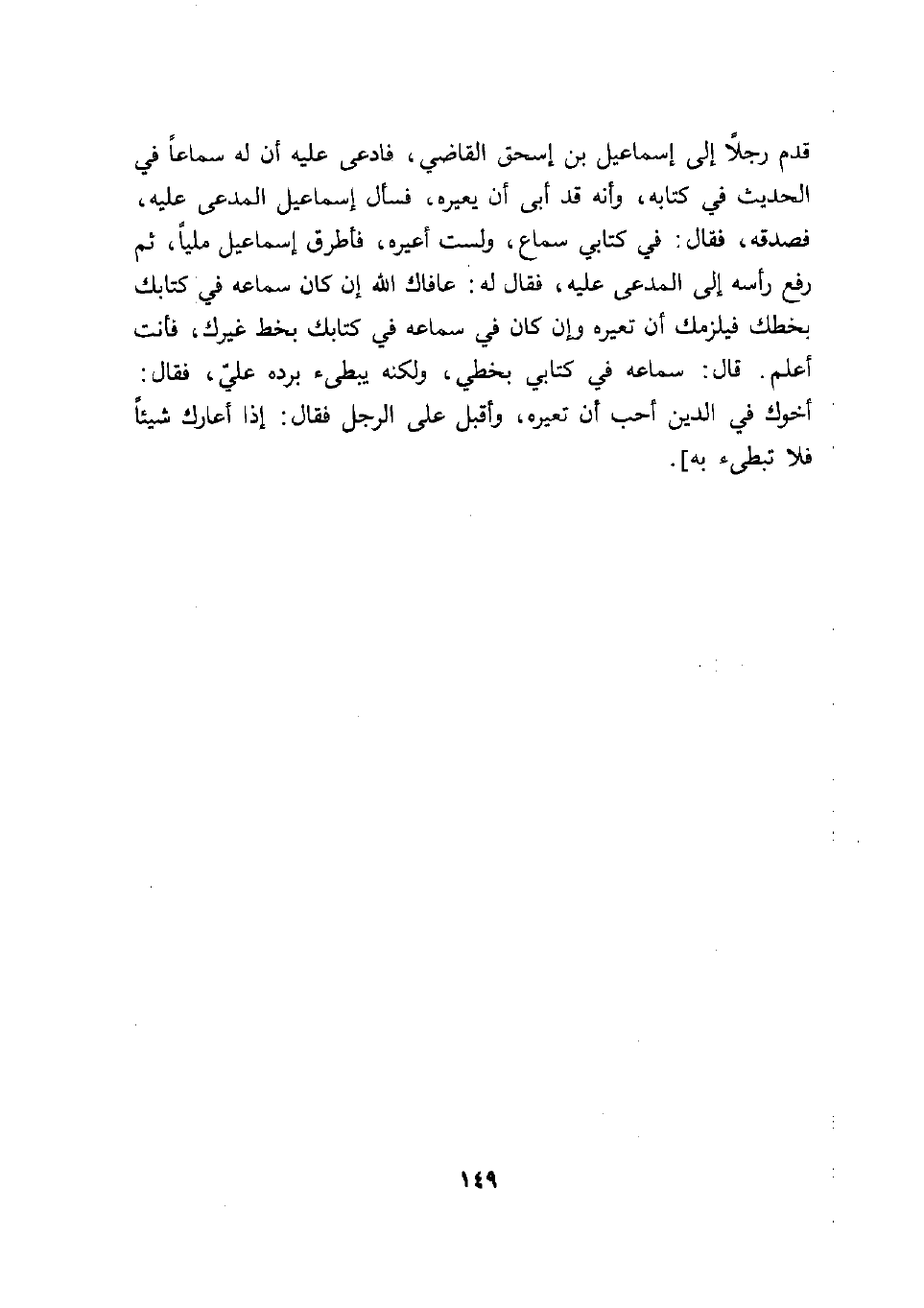 فصدقه، فقال: في كتابي سماع، ولست أعيره، فأطرق إسماعيل ملياً، ثم