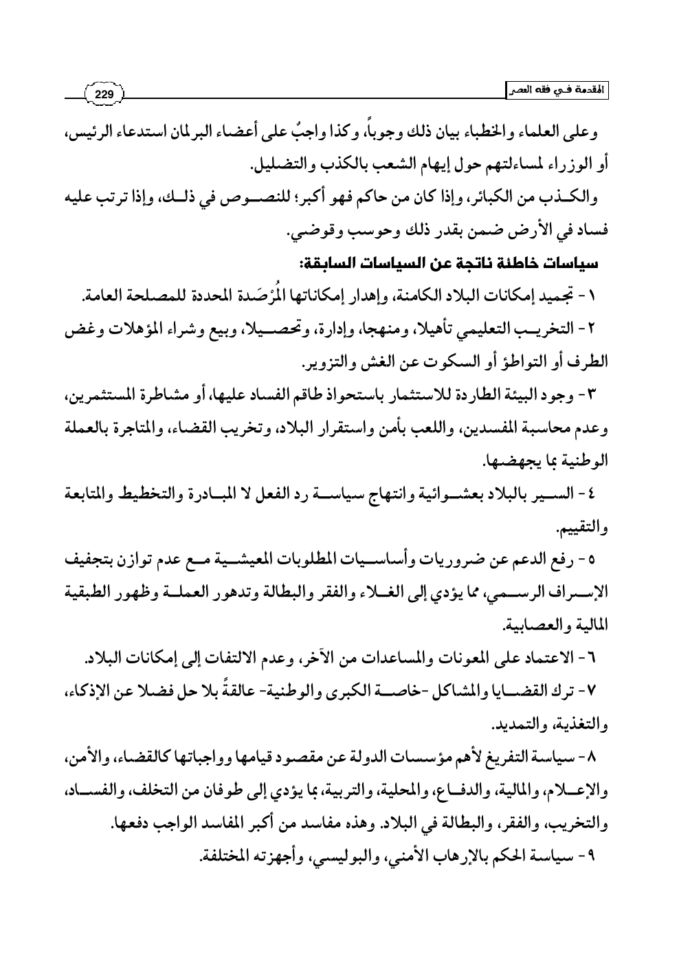 وعلى العلماء والخطباء بيان ذلك وجوباً، وكذا واجبٌ على أعضاء البرلمان استدعاء الرئيس، أو الوزراء لمساءلتهم حول إيهام الشعب بالكذب والتضليل.