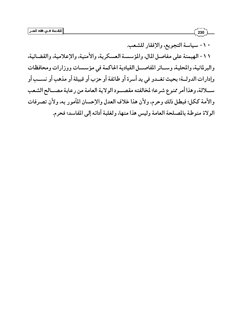 11 - الهيمنة على مفاصل المال، والمؤسسة العسكرية، والأمنية، والإعلامية، والقضائية، والبرلمانية، والمحلية، وسائر المفاصل القيادية الحاكمة في مؤسسات ووزارات ومحافظات وإدارات الدولة؛ بحيث تغدو في يد أسرة أو طائفة أو حزب أو قبيلة أو مذهب أو نسب أو سلالة، وهذا أمر ممنوع شرعا؛ لمخالفته مقصود الولاية العامة من رعاية مصالح الشعب والأمة ككل؛ فبطل ذلك وحرم، ولأن هذا خلاف العدل والإحسان المأمور به، ولأن تصرفات الولاة منوطة بالمصلحة العامة وليس هذا منها، ولغلبة أدائه إلى المفاسد؛ فحرم.
