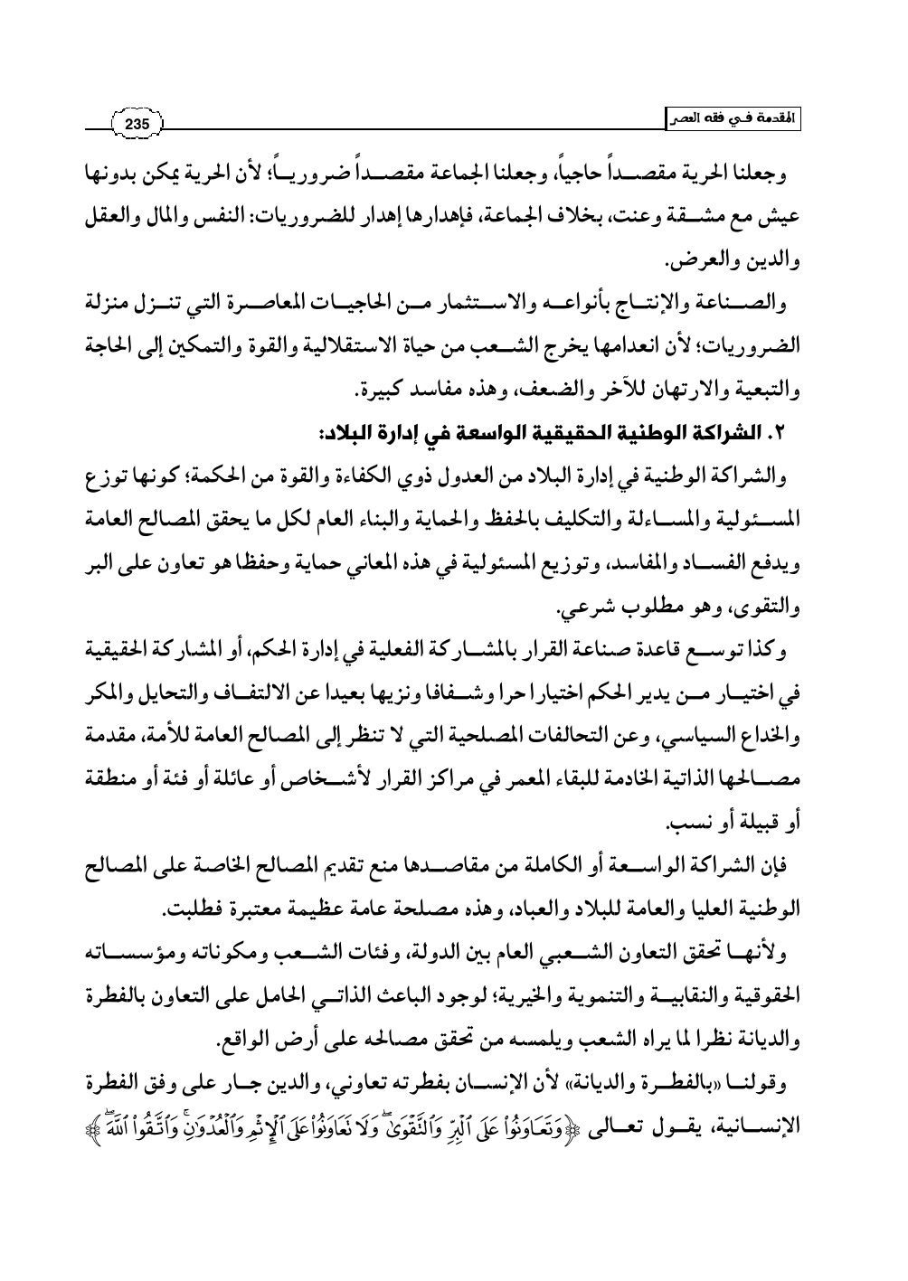 وقولنا «بالفطرة والديانة» لأن الإنسان بفطرته تعاوني، والدين جار على وفق الفطرة الإنسانية، يقول تعالى (وَتَعَاوَنُوا عَلَى الْبرِّ وَالتَّقْوَى وَلاَ تَعَاوَنُوا عَلَى الإِثْمِ وَالْعُدْوَانِ وَاتَّقُوا اللَّهَ)