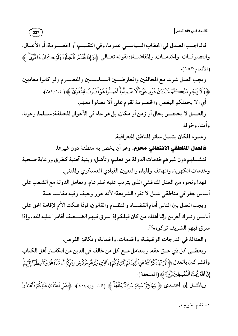 فالعدل المناطقي الانتقائي محرم، وهو أن يخص به منطقة دون غيرها.