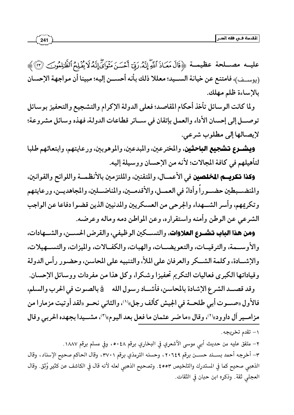 ومن هذا الباب تشرع العلاوات، والتسكين الوظيفي، والقرض الحسن، والشهادات، والأوسمة، والترقيات، والتعويضات، والهبات، والكفالات، والميزات، والتسهيلات، والإشادة، وكلمة الشكر والعرفان على الملأ، والتنبيه على المحاسن، وحضور رأس الدولة وقياداتها الكبرى فعاليات التكريم تحفيزا وشكرا، وكل هذا من مفردات ووسائل الإحسان.
