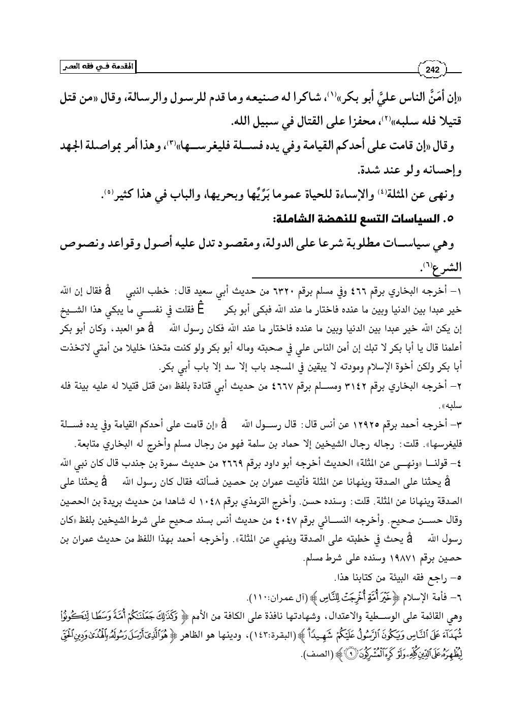 «إن أمَنَّ الناس عليَّ أبو بكر» (¬1)، شاكرا له صنيعه وما قدم للرسول والرسالة، وقال «من قتل قتيلا فله سلبه» (¬2)، محفزا على القتال في سبيل الله.
