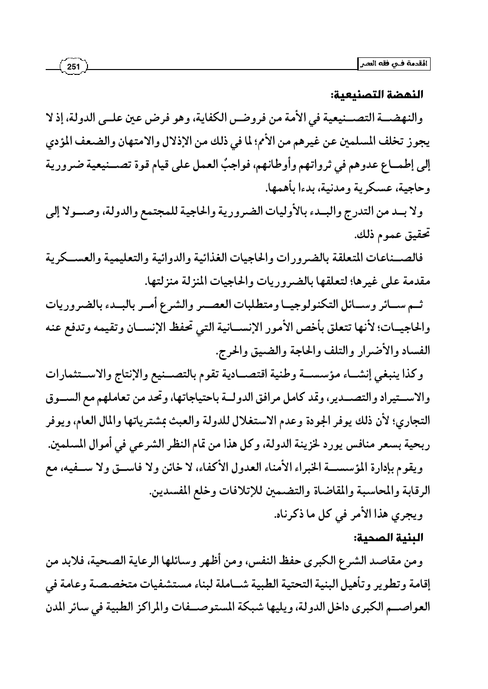 والنهضة التصنيعية في الأمة من فروض الكفاية، وهو فرض عين على الدولة، إذ لا يجوز تخلف المسلمين عن غيرهم من الأمم؛ لما في ذلك من الإذلال والامتهان والضعف المؤدي إلى إطماع عدوهم في ثرواتهم وأوطانهم، فواجبٌ العمل على قيام قوة تصنيعية ضرورية وحاجية، عسكرية ومدنية، بدءا بأهمها.