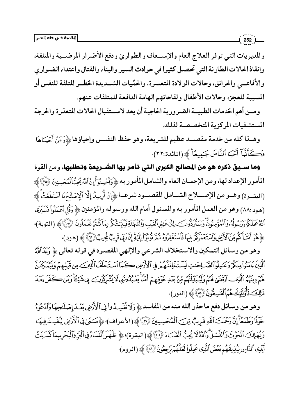 وما سبق ذكره هو من المصالح الكبرى التي تأمر بها الشريعة وتطلبها، ومن القوة المأمور الإعداد لها، ومن الإحسان العام والشامل المأمور به (وَأَحْسِنُوَا إِنَّ اللَّهَ يُحِبُّ الْمُحْسِنِينَ) (البقرة: 195) وهو من الإصلاح الشامل المقصود شرعا (إِنْ أُرِيدُ إِلاَّ الإِصْلاَحَ مَا اسْتَطَعْتُ) (هود: 88) وهو من العمل المأمور به والمسئول أمام الله ورسوله والمؤمنين (وَقُلِ اعْمَلُوا فَسَيَرَى اللَّهُ عَمَلَكُمْ وَرَسُولُهُ وَالْمُؤْمِنُونَ وَسَتُرَدُّونَ إِلَى عَالِمِ الْغَيْبِ وَالشَّهَادَةِ فَيُنَبِّئُكُم بِمَا كُنتُمْ تَعْمَلُونَ) (التوبة: 105)، (هُوَ أَنشَأَكُم مِّنَ الأَرْضِ وَاسْتَعْمَرَكُمْ فِيهَا فَاسْتَغْفِرُوهُ ثُمَّ تُوبُوا إِلَيْهِ إِنَّ رَبِّي قَرِيبٌ مُّجِيبٌ) (هود: 61).