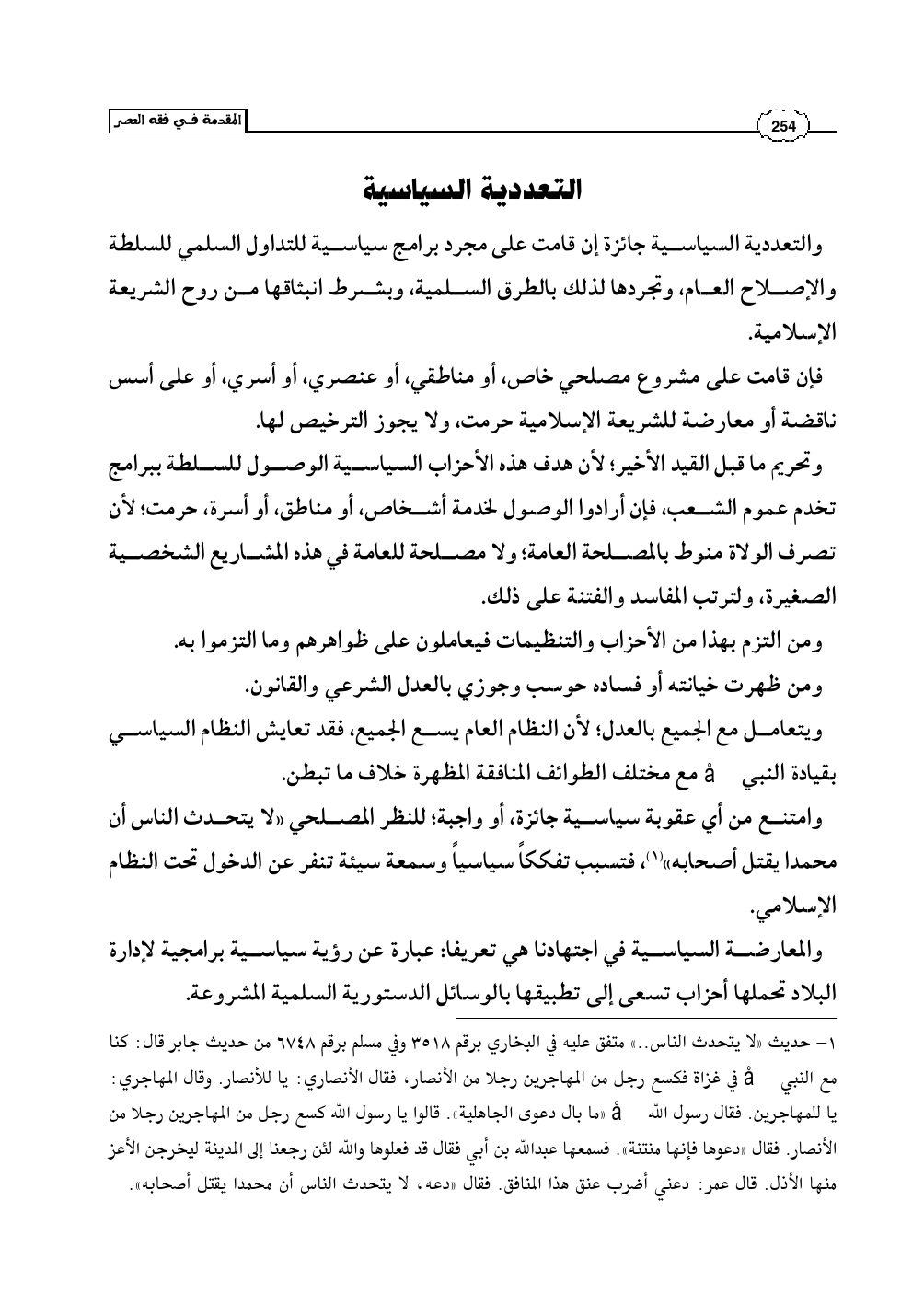والتعددية السياسية جائزة إن قامت على مجرد برامج سياسية للتداول السلمي للسلطة والإصلاح العام، وتجردها لذلك بالطرق السلمية، وبشرط انبثاقها من روح الشريعة الإسلامية.