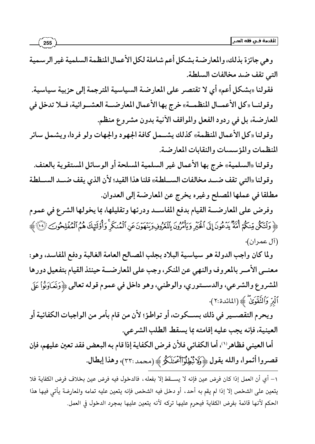 وفرض على المعارضة القيام بدفع المفاسد ودرئها وتقليلها، بما يخولها الشرع في عموم (وَلْتَكُن مِّنكُمْ أُمَّةٌ يَدْعُونَ إِلَى الْخَيْرِ وَيَأْمُرُونَ بِالْمَعْرُوفِ وَيَنْهَوْنَ عَنِ الْمُنكَرِ وَأُوْلَئِكَ هُمُ الْمُفْلِحُونَ) (آل عمران: 104).