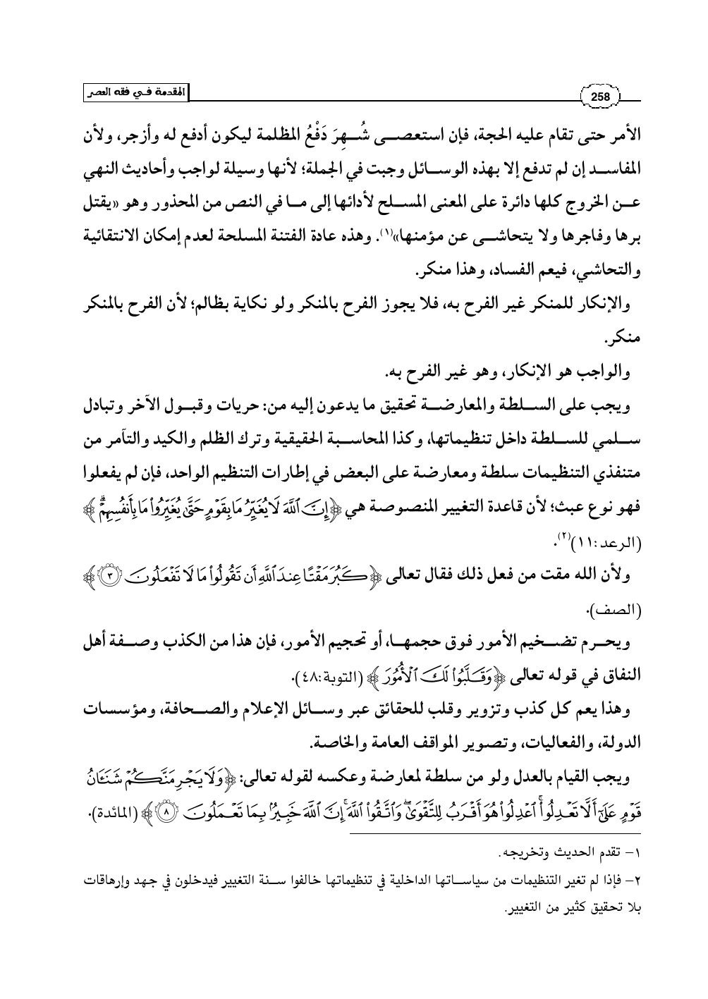 الأمر حتى تقام عليه الحجة، فإن استعصى شُهِرَ دَفْعُ المظلمة ليكون أدفع له وأزجر، ولأن المفاسد إن لم تدفع إلا بهذه الوسائل وجبت في الجملة؛ لأنها وسيلة لواجب وأحاديث النهي عن الخروج كلها دائرة على المعنى المسلح لأدائها إلى ما في النص من المحذور وهو «يقتل برها وفاجرها ولا يتحاشى عن مؤمنها» (¬1). وهذه عادة الفتنة المسلحة لعدم إمكان الانتقائية والتحاشي، فيعم الفساد، وهذا منكر.