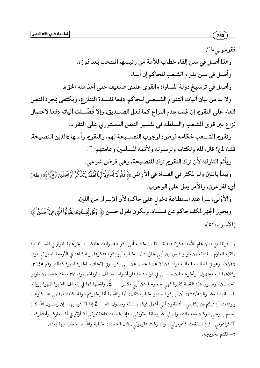(¬1) - قولنا «في بيان عام للأمة» ذكرنا فيه شيئا من خطبة أبي بكر «لقد وليت عليكم .. » أخرجها البزار في المسند ط/ مكتبة العلوم -المدينة من طريق قيس ابن أبي حازم قال: خطب أبو بكر، فذكرها. وله شاهد في الأوسط للطبراني برقم 8824، وهو في المطالب العالية برقم 2181 عن الحسن عن أبي بكر، وفي إتحاف الخيرة المهرة كذلك برقم 3645. وكلاهما فيه مجهول. وأخرجه ابن ماسي في فوائده ط/ دار أضواء السلف بالرياض برقم 37 بسند حسن من طريق الحسن، وطرق هذه القصة كثيرة فهي صحيحة عن أبي بكر رضي الله عنه. ولفظها كما في إتحاف الخيرة المهرة بزوائد المسانيد العشرة (5/ 22): أن أبابكر الصديق خطب فقال: أما والله ما أنا بخيركم، ولقد كنت بمقامي هذا كارهًا، ولوددت أن فيكم من يكفيني، أفتظنون أني أعمل فيكم بسنة رسول الله صلى الله عليه وسلم إذا لا أقوم بها، إن رسول الله كان يعصم بالوحي، وكان معه ملك، وإن لي شيطانًا يعترّيني، فإذا غضبت فاجتنبوني ألا أؤثر في أشعاركم وأبشاركم، ألا فراعوني، فإن استقمت فأعينوني، وإن زغت فقوموني. قال الحسن: خطبة والله ما خطب بها بعده.