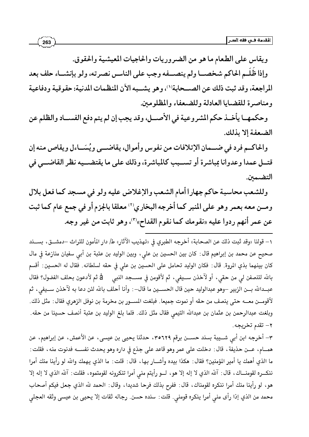 (¬1) - قولنا «وقد ثبت ذلك عن الصحابة» أخرجه الطبري في «تهذيب الآثار» ط/ دار المأمون للتراث -دمشق، بسند صحيح عن محمد بن إبراهيم قال: كان بين الحسين بن علي، وبين الوليد بن عتبة بن أبي سفيان منازعة في مال كان بينهما بذي المروة. قال: فكان الوليد تحامل على الحسين بن علي في حقه لسلطانه. فقال له الحسين: أقسم بالله لتنصفن لي من حقي، أو لآخذن سيفي، ثم لأقومن في مسجد النبي صلى الله عليه وسلم ثم لأدعون بحلف الفضول؟ فقال عبدالله بن الزبير -وهو عبدالوليد حين قال الحسين ما قال-: وأنا أحلف بالله لئن دعا به لآخذن سيفي، ثم لأقومن معه حتى ينصف من حقه أو نموت جميعا. فبلغت المسور بن مخرمة بن نوفل الزهري فقال: مثل ذلك. وبلغت عبدالرحمن بن عثمان بن عبدالله التيمي فقال مثل ذلك. فلما بلغ الوليد بن عتبة أنصف حسينا من حقه.