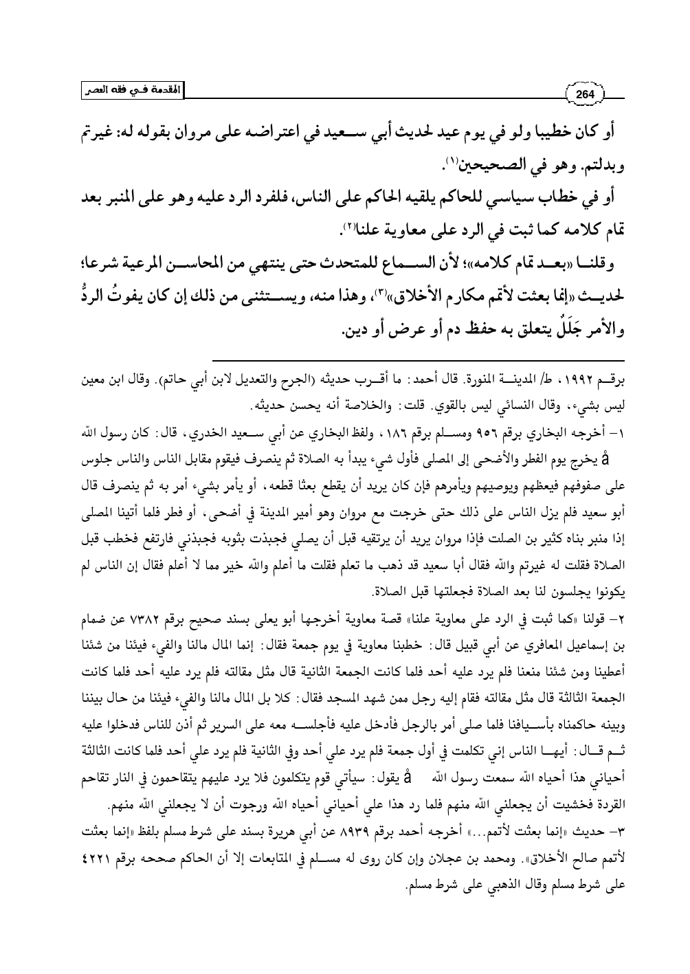 (¬2) - قولنا «كما ثبت في الرد على معاوية علنا» قصة معاوية أخرجها أبو يعلى بسند صحيح برقم 7382 عن ضمام بن إسماعيل المعافري عن أبي قبيل قال: خطبنا معاوية في يوم جمعة فقال: إنما المال مالنا والفيء فيئنا من شئنا أعطينا ومن شئنا منعنا فلم يرد عليه أحد فلما كانت الجمعة الثانية قال مثل مقالته فلم يرد عليه أحد فلما كانت الجمعة الثالثة قال مثل مقالته فقام إليه رجل ممن شهد المسجد فقال: كلا بل المال مالنا والفيء فيئنا من حال بيننا وبينه حاكمناه بأسيافنا فلما صلى أمر بالرجل فأدخل عليه فأجلسه معه على السرير ثم أذن للناس فدخلوا عليه ثم قال: أيها الناس إني تكلمت في أول جمعة فلم يرد علي أحد وفي الثانية فلم يرد علي أحد فلما كانت الثالثة أحياني هذا أحياه الله سمعت رسول الله صلى الله عليه وسلم يقول: سيأتي قوم يتكلمون فلا يرد عليهم يتقاحمون في النار تقاحم القردة فخشيت أن يجعلني الله منهم فلما رد هذا علي أحياني أحياه الله ورجوت أن لا يجعلني الله منهم.