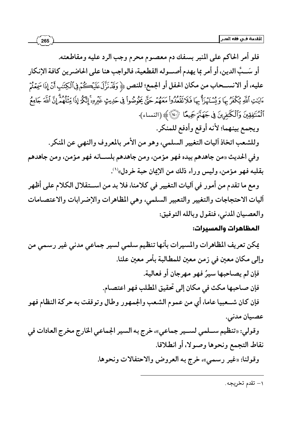 وقولي: «تنظيم سلمي لسير جماعي»، خرج به السير الجماعي الخارج مخرج العادات في نقاط التجمع ونحوها وصولا، أو انطلاقا.