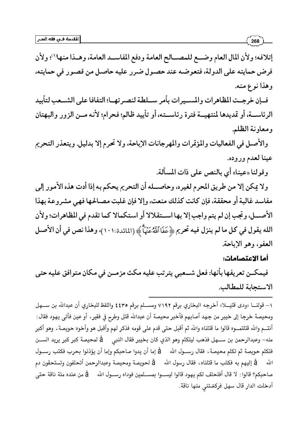 (¬1) - قولنا «ودى قتيلا» أخرجه البخاري برقم 7192 ومسلم برقم 4435 واللفظ للبخاري أن عبدالله بن سهل ومحيصة خرجا إلى خيبر من جهد أصابهم فأخبر محيصة أن عبدالله قتل وطرح في فقير، أو عين فأتى يهود فقال: أنتم والله قتلتموه قالوا ما قتلناه والله ثم أقبل حتى قدم على قومه فذكر لهم وأقبل هو وأخوه حويصة، وهو أكبر منه- وعبدالرحمن بن سهل فذهب ليتكلم وهو الذي كان بخيبر فقال النبي صلى الله عليه وسلم لمحيصة كبر كبر يريد السن فتكلم حويصة ثم تكلم محيصة، فقال رسول الله صلى الله عليه وسلم إما أن يدوا صاحبكم وإما أن يؤذنوا بحرب فكتب رسول الله صلى الله عليه وسلم إليهم به فكتب ما قتلناه، فقال رسول الله صلى الله عليه وسلم لحويصة ومحيصة وعبدالرحمن أتحلفون وتستحقون دم صاحبكم؟ قالوا: لا قال أفتحلف لكم يهود قالوا ليسوا بمسلمين فوداه رسول الله صلى الله عليه وسلم من عنده مئة ناقة حتى أدخلت الدار قال سهل فركضتني منها ناقة.
