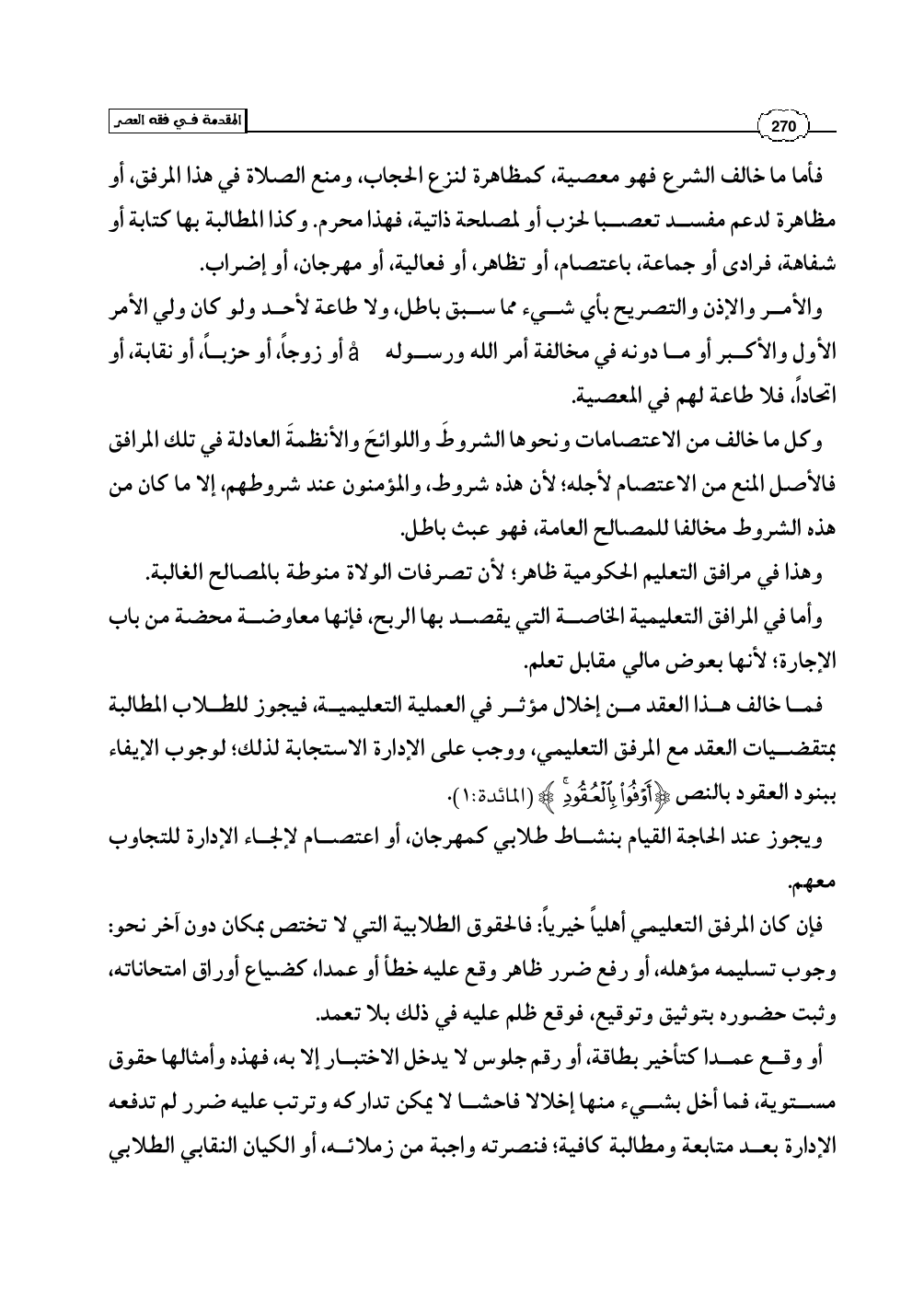 وكل ما خالف من الاعتصامات ونحوها الشروطَ واللوائحَ والأنظمةَ العادلة في تلك المرافق فالأصل المنع من الاعتصام لأجله؛ لأن هذه شروط، والمؤمنون عند شروطهم، إلا ما كان من هذه الشروط مخالفا للمصالح العامة، فهو عبث باطل.