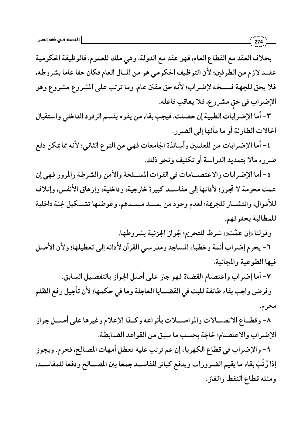 4 - أما الإضرابات من المعلمين وأساتذة الجامعات فهي من النوع الثاني؛ لأنه مما يمكن دفع ضرره مآلا بتمديد الدراسة أو تكثيف ونحو ذلك.