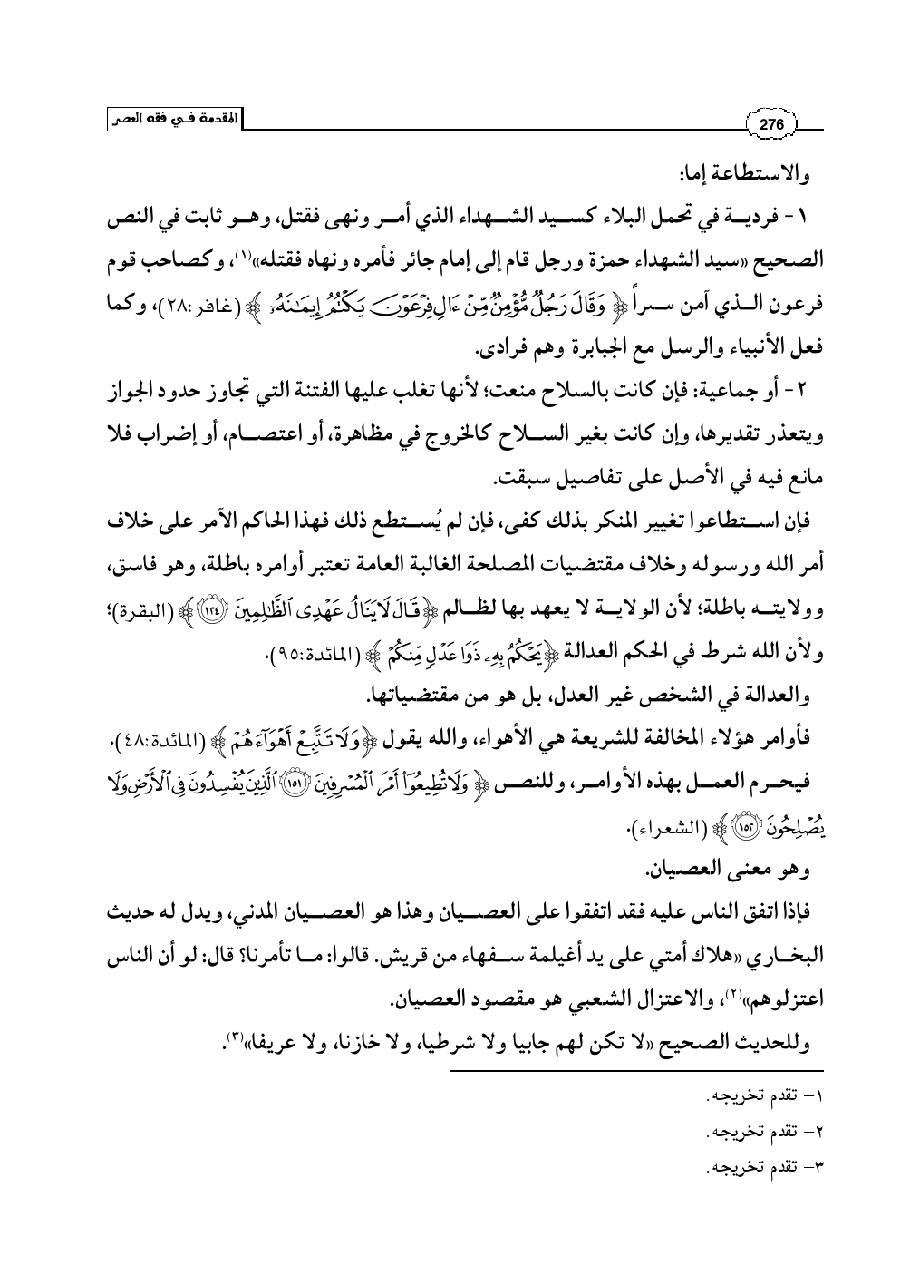 فإذا اتفق الناس عليه فقد اتفقوا على العصيان وهذا هو العصيان المدني، ويدل له حديث البخاري «هلاك أمتي على يد أغيلمة سفهاء من قريش. قالوا: ما تأمرنا؟ قال: لو أن الناس اعتزلوهم» (¬2)، والاعتزال الشعبي هو مقصود العصيان.