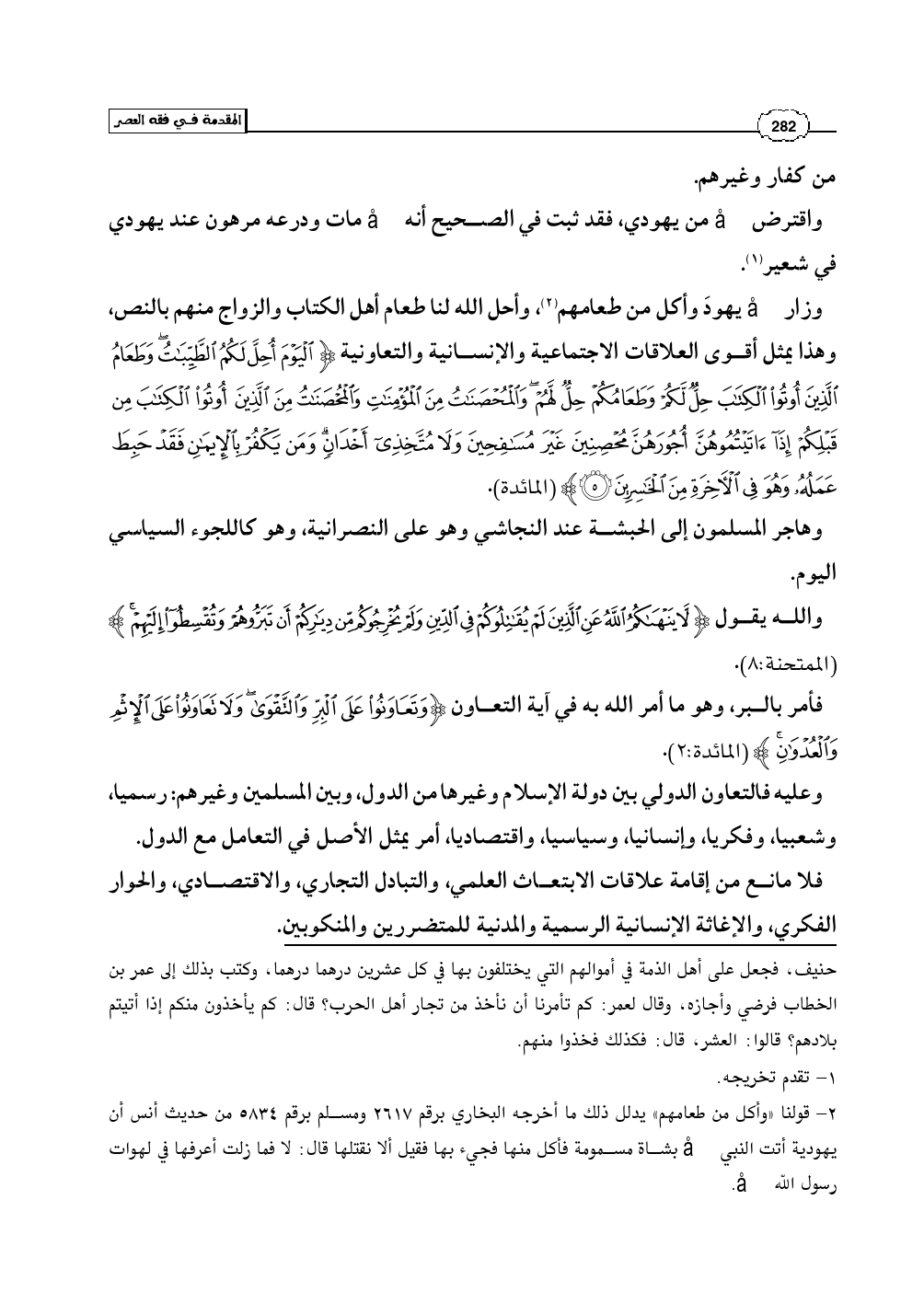 وزار صلى الله عليه وسلم يهودَ وأكل من طعامهم (¬2)، وأحل الله لنا طعام أهل الكتاب والزواج منهم بالنص، وهذا يمثل أقوى العلاقات الاجتماعية والإنسانية والتعاونية (الْيَوْمَ أُحِلَّ لَكُمُ الطَّيِّبَاتُ وَطَعَامُ الَّذِينَ أُوتُوا الْكِتَابَ حِلٌّ لَّكُمْ وَطَعَامُكُمْ حِلُّ لَّهُمْ وَالْمُحْصَنَاتُ مِنَ الْمُؤْمِنَاتِ وَالْمُحْصَنَاتُ مِنَ الَّذِينَ أُوتُوا الْكِتَابَ مِن قَبْلِكُمْ إِذَا آتَيْتُمُوهُنَّ أُجُورَهُنَّ مُحْصِنِينَ غَيْرَ مُسَافِحِينَ وَلاَ مُتَّخِذِي أَخْدَانٍ وَمَن يَكْفُرْ بِالإِيمَانِ فَقَدْ حَبِطَ عَمَلُهُ وَهُوَ فِي الآخِرَةِ مِنَ الْخَاسِرِينَ) (المائدة: 5).