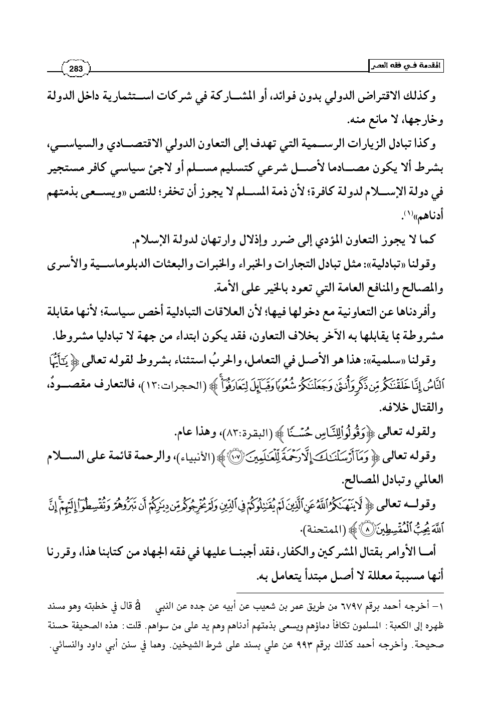 وكذا تبادل الزيارات الرسمية التي تهدف إلى التعاون الدولي الاقتصادي والسياسي، بشرط ألا يكون مصادما لأصل شرعي كتسليم مسلم أو لاجئ سياسي كافر مستجير في دولة الإسلام لدولة كافرة؛ لأن ذمة المسلم لا يجوز أن تخفر؛ للنص «ويسعى بذمتهم أدناهم» (¬1).