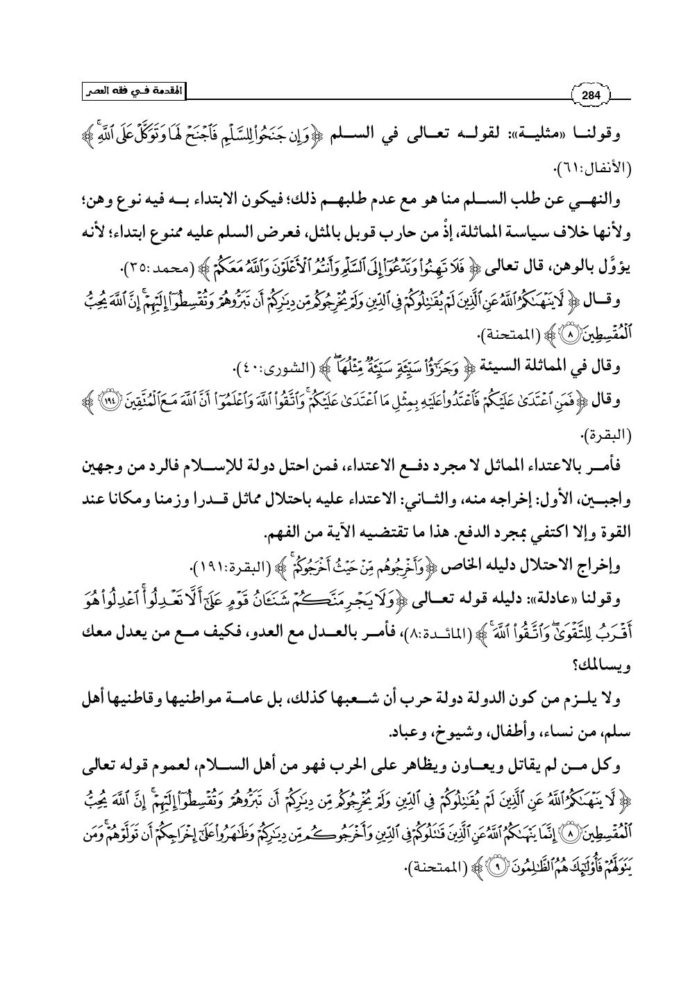 وقولنا «مثلية»: لقوله تعالى في السلم (وَإِن جَنَحُوا لِلسَّلْمِ فَاجْنَحْ لَهَا وَتَوَكَّلْ عَلَى اللَّهِ) (الأنفال: 61).