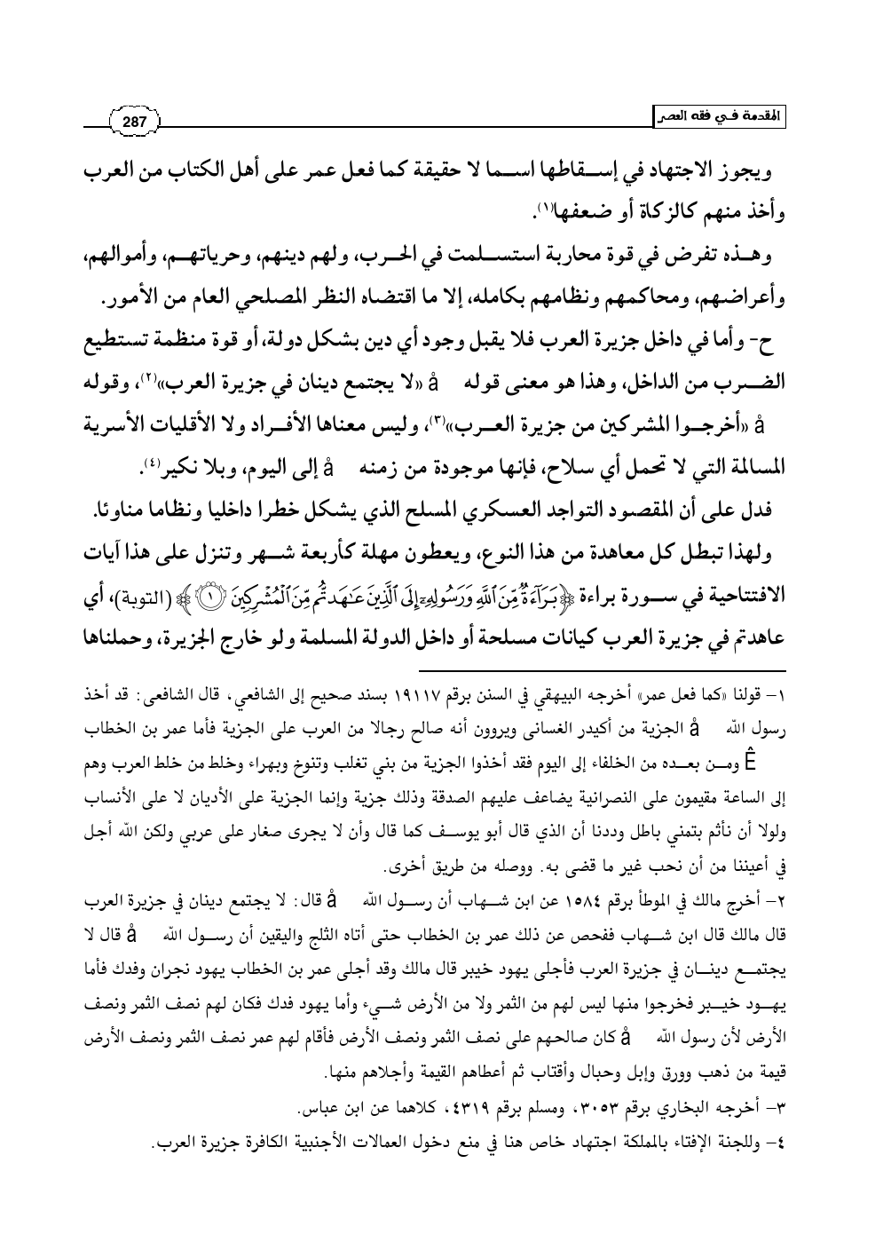 ولهذا تبطل كل معاهدة من هذا النوع، ويعطون مهلة كأربعة شهر وتنزل على هذا آيات الافتتاحية في سورة براءة (بَرَاءةٌ مِّنَ اللَّهِ وَرَسُولِهِ إِلَى الَّذِينَ عَاهَدتُّم مِّنَ الْمُشْرِكِينَ) (التوبة: 1)، أي عاهدتم في جزيرة العرب كيانات مسلحة أو داخل الدولة المسلمة ولو خارج الجزيرة، وحملناها