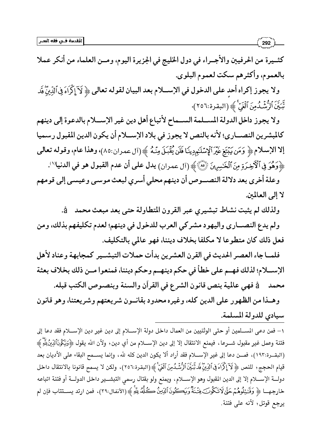 فلما جاء العصر الحديث في القرن العشرين بدأت حملات التبشير كمجابهة وعناد لأهل الإسلام؛ لذلك فهم على خطأ في حكم دينهم وحكم ديننا، فمنعوا من ذلك بخلاف بعثة محمد صلى الله عليه وسلم فهي عالمية بنص قانون الشرع في القرآن والسنة وبنصوص الكتب قبله.