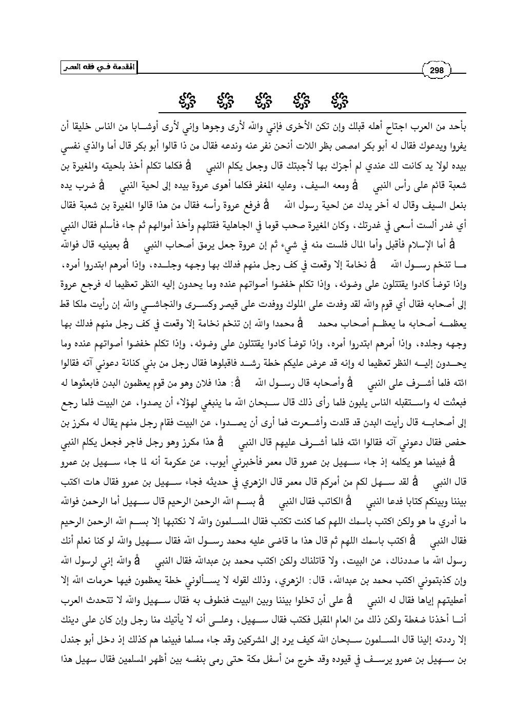 = بأحد من العرب اجتاح أهله قبلك وإن تكن الأخرى فإني والله لأرى وجوها وإني لأرى أوشابا من الناس خليقا أن يفروا ويدعوك فقال له أبو بكر امصص بظر اللات أنحن نفر عنه وندعه فقال من ذا قالوا أبو بكر قال أما والذي نفسي بيده لولا يد كانت لك عندي لم أجزك بها لأجبتك قال وجعل يكلم النبي صلى الله عليه وسلم فكلما تكلم أخذ بلحيته والمغيرة بن شعبة قائم على رأس النبي صلى الله عليه وسلم ومعه السيف، وعليه المغفر فكلما أهوى عروة بيده إلى لحية النبي صلى الله عليه وسلم ضرب يده بنعل السيف وقال له أخر يدك عن لحية رسول الله صلى الله عليه وسلم فرفع عروة رأسه فقال من هذا قالوا المغيرة بن شعبة فقال أي غدر ألست أسعى في غدرتك، وكان المغيرة صحب قوما في الجاهلية فقتلهم وأخذ أموالهم ثم جاء فأسلم فقال النبي صلى الله عليه وسلم أما الإسلام فأقبل وأما المال فلست منه في شيء ثم إن عروة جعل يرمق أصحاب النبي صلى الله عليه وسلم بعينيه قال فوالله ما تنخم رسول الله صلى الله عليه وسلم نخامة إلا وقعت في كف رجل منهم فدلك بها وجهه وجلده، وإذا أمرهم ابتدروا أمره، وإذا توضأ كادوا يقتتلون على وضوئه، وإذا تكلم خفضوا أصواتهم عنده وما يحدون إليه النظر تعظيما له فرجع عروة إلى أصحابه فقال أي قوم والله لقد وفدت على الملوك ووفدت على قيصر وكسرى والنجاشي والله إن رأيت ملكا قط يعظمه أصحابه ما يعظم أصحاب محمد صلى الله عليه وسلم محمدا والله إن تنخم نخامة إلا وقعت في كف رجل منهم فدلك بها وجهه وجلده، وإذا أمرهم ابتدروا أمره، وإذا توضأ كادوا يقتتلون على وضوئه، وإذا تكلم خفضوا أصواتهم عنده وما يحدون إليه النظر تعظيما له وإنه قد عرض عليكم خطة رشد فاقبلوها فقال رجل من بني كنانة دعوني آته فقالوا ائته فلما أشرف على النبي صلى الله عليه وسلم وأصحابه قال رسول الله صلى الله عليه وسلم: هذا فلان وهو من قوم يعظمون البدن فابعثوها له فبعثت له واستقبله الناس يلبون فلما رأى ذلك قال سبحان الله ما ينبغي لهؤلاء أن يصدوا، عن البيت فلما رجع إلى أصحابه قال رأيت البدن قد قلدت وأشعرت فما أرى أن يصدوا، عن البيت فقام رجل منهم يقال له مكرز بن حفص فقال دعوني آته فقالوا ائته فلما أشرف عليهم قال النبي صلى الله عليه وسلم هذا مكرز وهو رجل فاجر فجعل يكلم النبي صلى الله عليه وسلم فبينما هو يكلمه إذ جاء سهيل بن عمرو قال معمر فأخبرني أيوب، عن عكرمة أنه لما جاء سهيل بن عمرو قال النبي صلى الله عليه وسلم لقد سهل لكم من أمركم قال معمر قال الزهري في حديثه فجاء سهيل بن عمرو فقال هات اكتب بيننا وبينكم كتابا فدعا النبي صلى الله عليه وسلم الكاتب فقال النبي صلى الله عليه وسلم بسم الله الرحمن الرحيم قال سهيل أما الرحمن فوالله ما أدري ما هو ولكن اكتب باسمك اللهم كما كنت تكتب فقال المسلمون والله لا نكتبها إلا بسم الله الرحمن الرحيم فقال النبي صلى الله عليه وسلم اكتب باسمك اللهم ثم قال هذا ما قاضى عليه محمد رسول الله فقال سهيل والله لو كنا نعلم أنك رسول الله ما صددناك، عن البيت، ولا قاتلناك ولكن اكتب محمد بن عبدالله فقال النبي صلى الله عليه وسلم والله إني لرسول الله وإن كذبتموني اكتب محمد بن عبدالله، قال: الزهري، وذلك لقوله لا يسألوني خطة يعظمون فيها حرمات الله إلا أعطيتهم إياها فقال له النبي صلى الله عليه وسلم على أن تخلوا بيننا وبين البيت فنطوف به فقال سهيل والله لا تتحدث العرب أنا أخذنا ضغطة ولكن ذلك من العام المقبل فكتب فقال سهيل، وعلى أنه لا يأتيك منا رجل وإن كان على دينك إلا رددته إلينا قال المسلمون سبحان الله كيف يرد إلى المشركين وقد جاء مسلما فبينما هم كذلك إذ دخل أبو جندل بن سهيل بن عمرو يرسف في قيوده وقد خرج من أسفل مكة حتى رمى بنفسه بين أظهر المسلمين فقال سهيل هذا =