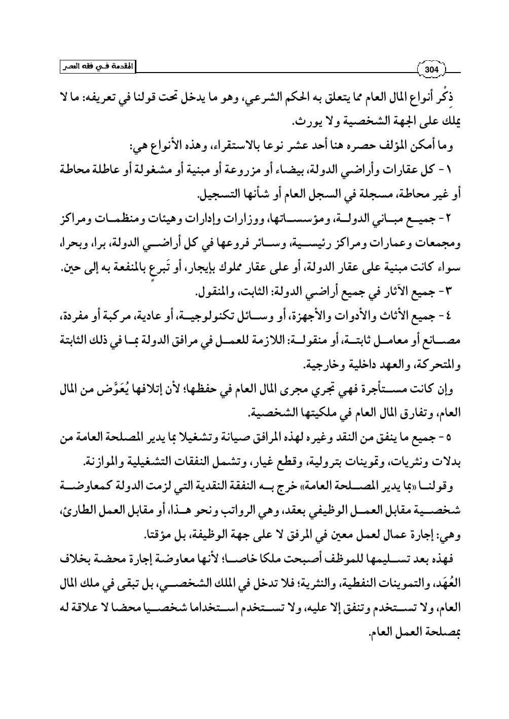 ذِكْر أنواع المال العام مما يتعلق به الحكم الشرعي، وهو ما يدخل تحت قولنا في تعريفه: ما لا يملك على الجهة الشخصية ولا يورث.