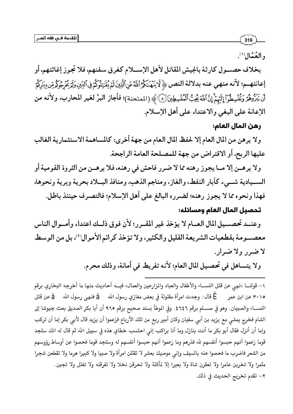 (¬1) - قولنا «نهي عن قتل النساء والأطفال والعباد والمزارعين والعمال» فيه أحاديث منها ما أخرجه البخاري برقم 3015 عن ابن عمر رضي الله عنهما قال: وجدت امرأة مقتولة في بعض مغازي رسول الله صلى الله عليه وسلم فنهى رسول الله صلى الله عليه وسلم عن قتل النساء والصبيان. وهو في مسلم برقم 4646. وفي الموطأ بسند صحيح برقم 965 أن أبا بكر الصديق بعث جيوشا إلى الشام فخرج يمشي مع يزيد بن أبي سفيان وكان أمير ربع من تلك الأرباع فزعموا أن يزيد قال لأبي بكر إما أن تركب وإما أن أنزل فقال أبو بكر ما أنت بنازل وما أنا براكب إني احتسب خطاي هذه في سبيل الله ثم قال له انك ستجد قوما زعموا أنهم حبسوا أنفسهم لله فذرهم وما زعموا أنهم حبسوا أنفسهم له وستجد قوما فحصوا عن أوساط رؤوسهم من الشعر فاضرب ما فحصوا عنه بالسيف وإني موصيك بعشر لا تقتلن امرأة ولا صبيا ولا كبيرا هرما ولا تقطعن شجرا مثمرا ولا تخربن عامرا ولا تعقرن شاة ولا بعيرا إلا لمأكلة ولا تحرقن نخلا ولا تفرقنه ولا تغلل ولا تجبن.