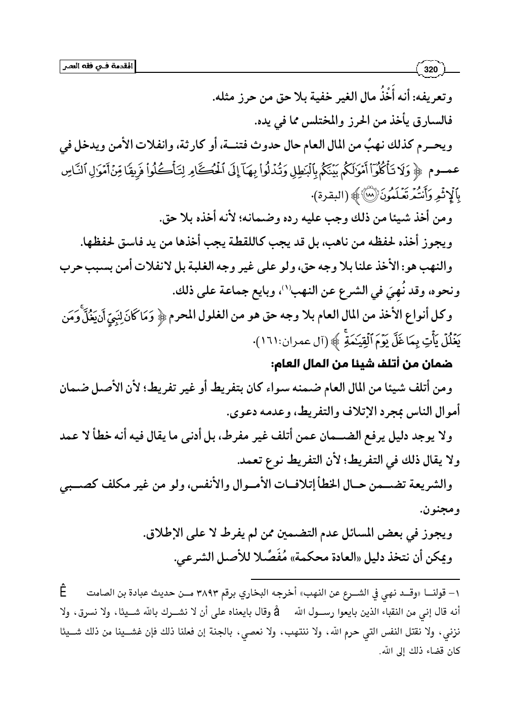 (¬1) - قولنا «وقد نهي في الشرع عن النهب» أخرجه البخاري برقم 3893 من حديث عبادة بن الصامت رضي الله عنه أنه قال إني من النقباء الذين بايعوا رسول الله صلى الله عليه وسلم وقال بايعناه على أن لا نشرك بالله شيئا، ولا نسرق، ولا نزني، ولا نقتل النفس التي حرم الله، ولا ننتهب، ولا نعصي، بالجنة إن فعلنا ذلك فإن غشينا من ذلك شيئا كان قضاء ذلك إلى الله.