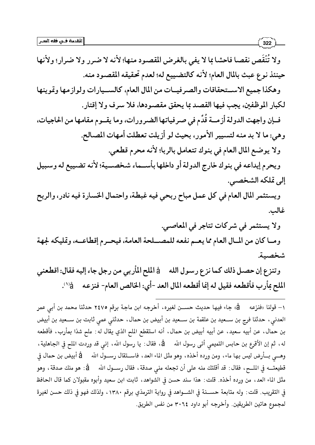 (¬1) - قولنا «فنزعه صلى الله عليه وسلم» جاء فيها حديث حسن لغيره، أخرجه ابن ماجة برقم 2475 حدثنا محمد بن أبي عمر العدني، حدثنا فرج بن سعيد بن علقمة بن سعيد بن أبيض بن حمال، حدثني عمي ثابت بن سعيد بن أبيض بن حمال، عن أبيه سعيد، عن أبيه أبيض بن حمال، أنه استقطع الملح الذي يقال له: ملح شذا بمأرب، فأقطعه له، ثم إن الأقرع بن حابس التميمي أتى رسول الله صلى الله عليه وسلم، فقال: يا رسول الله، إني قد وردت الملح في الجاهلية، وهي بأرض ليس بها ماء، ومن ورده أخذه، وهو مثل الماء العد، فاستقال رسول الله صلى الله عليه وسلم أبيض بن حمال في قطيعته في الملح، فقال: قد أقلتك منه على أن تجعله مني صدقة، فقال رسول الله صلى الله عليه وسلم: هو منك صدقة، وهو مثل الماء العد، من ورده أخذه. قلت: هذا سند حسن في الشواهد، ثابت ابن سعيد وأبوه مقبولان كما قال الحافظ في التقريب. قلت: وله متابعة حسنة في الشواهد في رواية الترمذي برقم 1380، ولذلك فهو في ذلك حسن لغيرة لمجموع هاتين الطريقين. وأخرجه أبو داود 3064 من نفس الطريق.